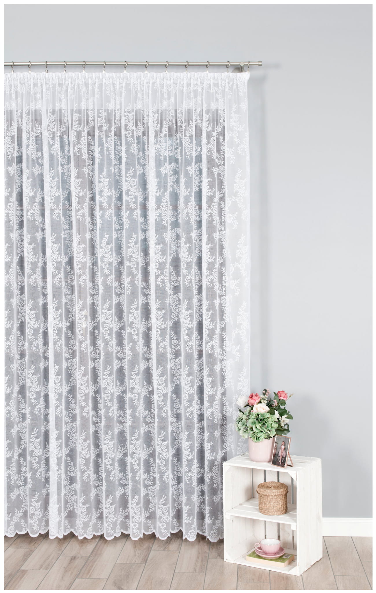 Firana Długa 450x250 Firanka do Pokoju na Żabki Biała Kwiaty 10913