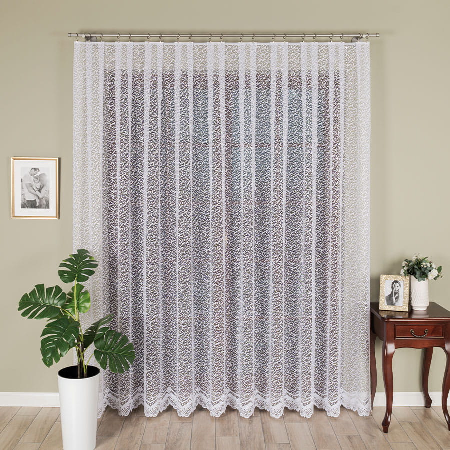Gotowa firana żakardowa z wzorem po całości. Firana jest lekka i podatna na układanie. Bardzo dobrze przepuszcza światło. Boki zostały starannie obszyte w naszej pracowni. Długa firanka będzie idealna jako firana do pokoju. Gotowa do zawieszenia za pomocą żabek.