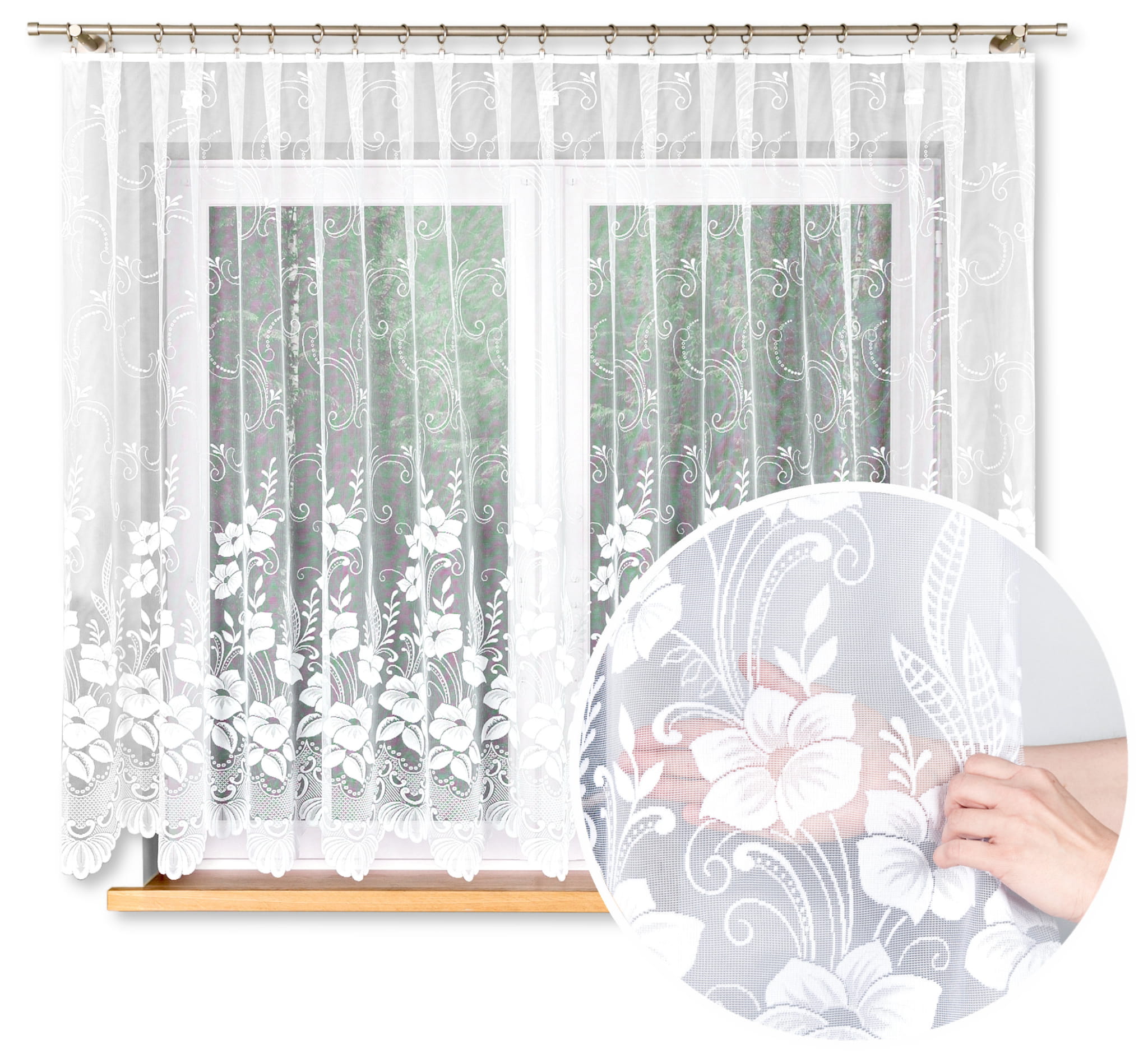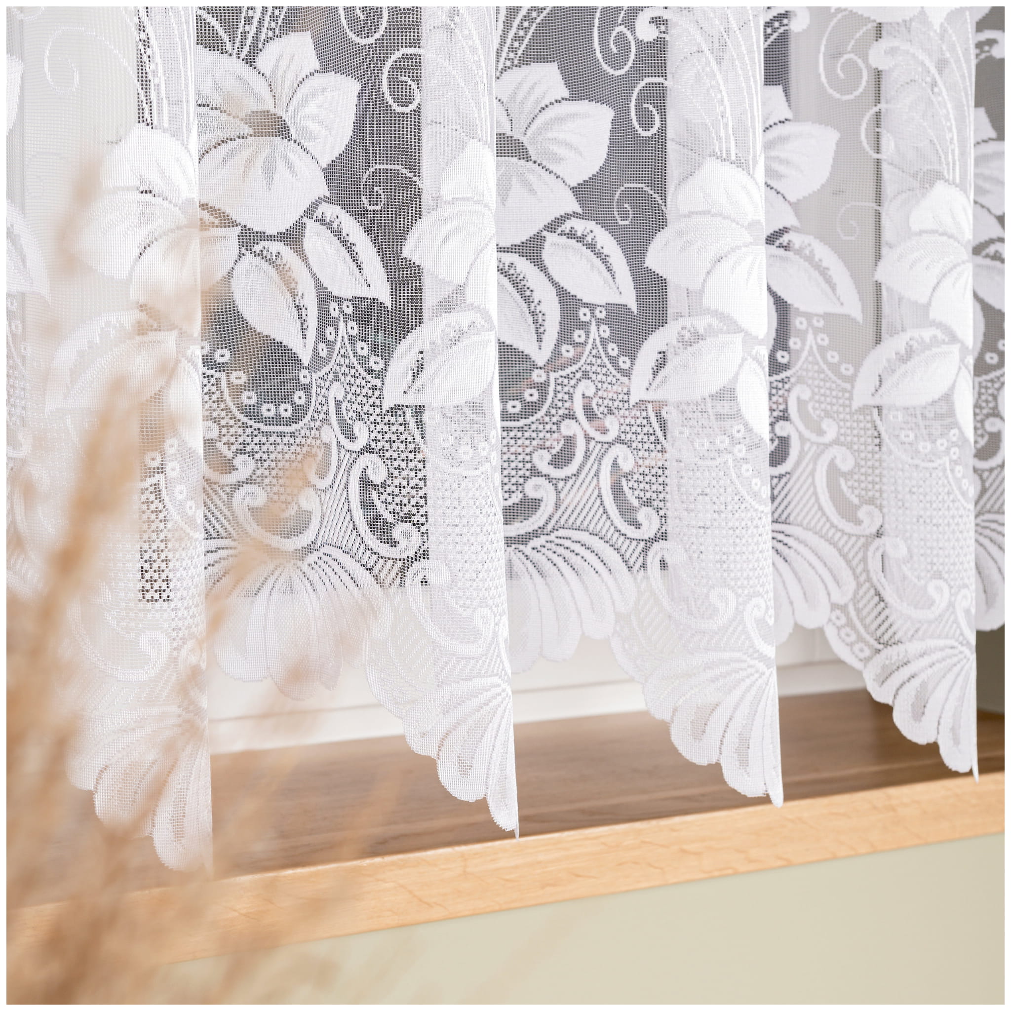 Gotowa firana żakardowa z kwiatowym wzorem. Firana jest lekka i podatna na układanie. Bardzo dobrze przepuszcza światło. Boki zostały starannie obszyte w naszej pracowni. Krótka firanka będzie idealna jako firana do kuchni lub pokoju. Gotowa do zawieszenia za pomocą żabek.