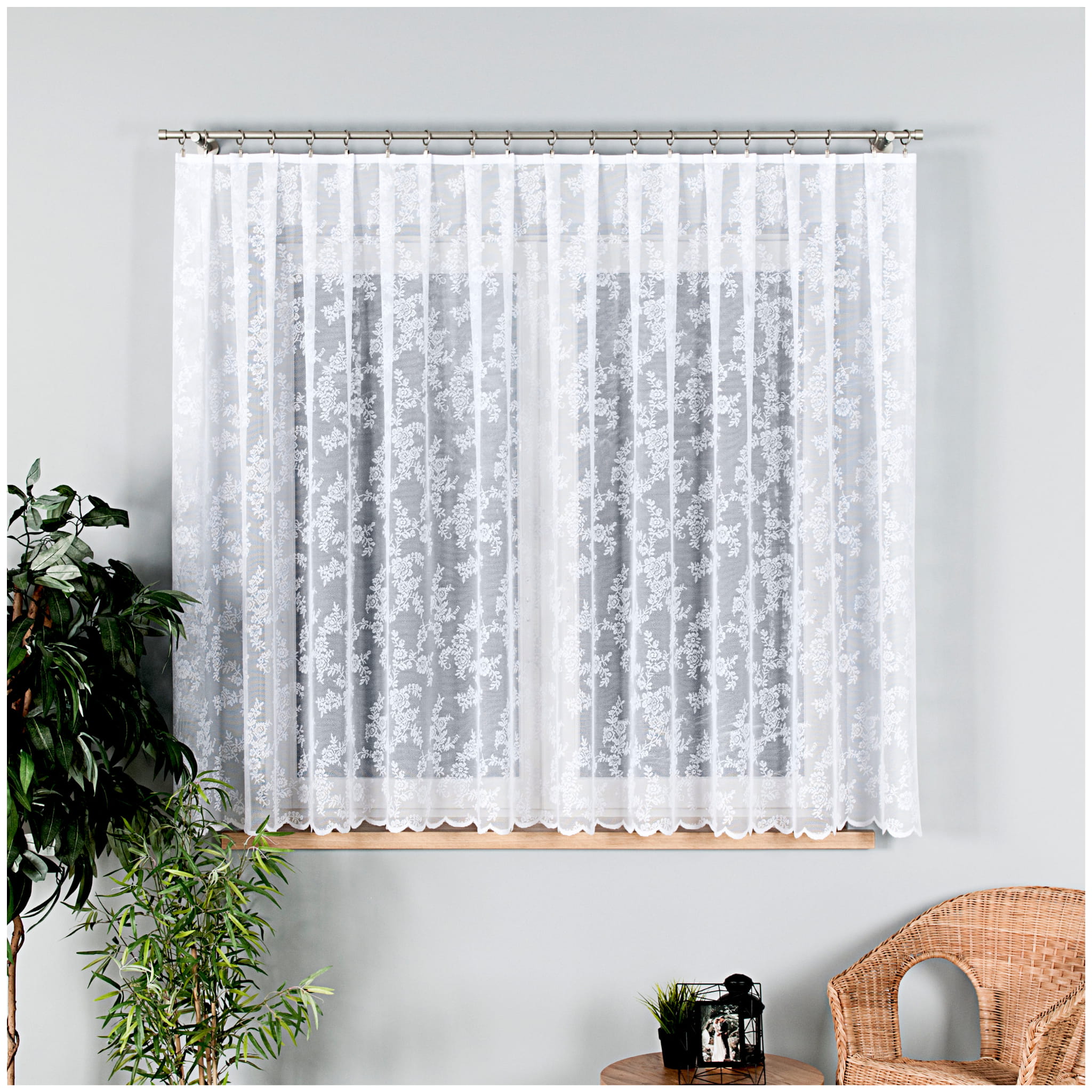 Gotowa firana żakardowa z kwiatowym wzorem. Firana jest lekka i podatna na układanie. Bardzo dobrze przepuszcza światło. Boki zostały starannie obszyte w naszej pracowni. Krótka firanka będzie idealna jako firana do kuchni lub pokoju. Gotowa do zawieszenia za pomocą żabek.