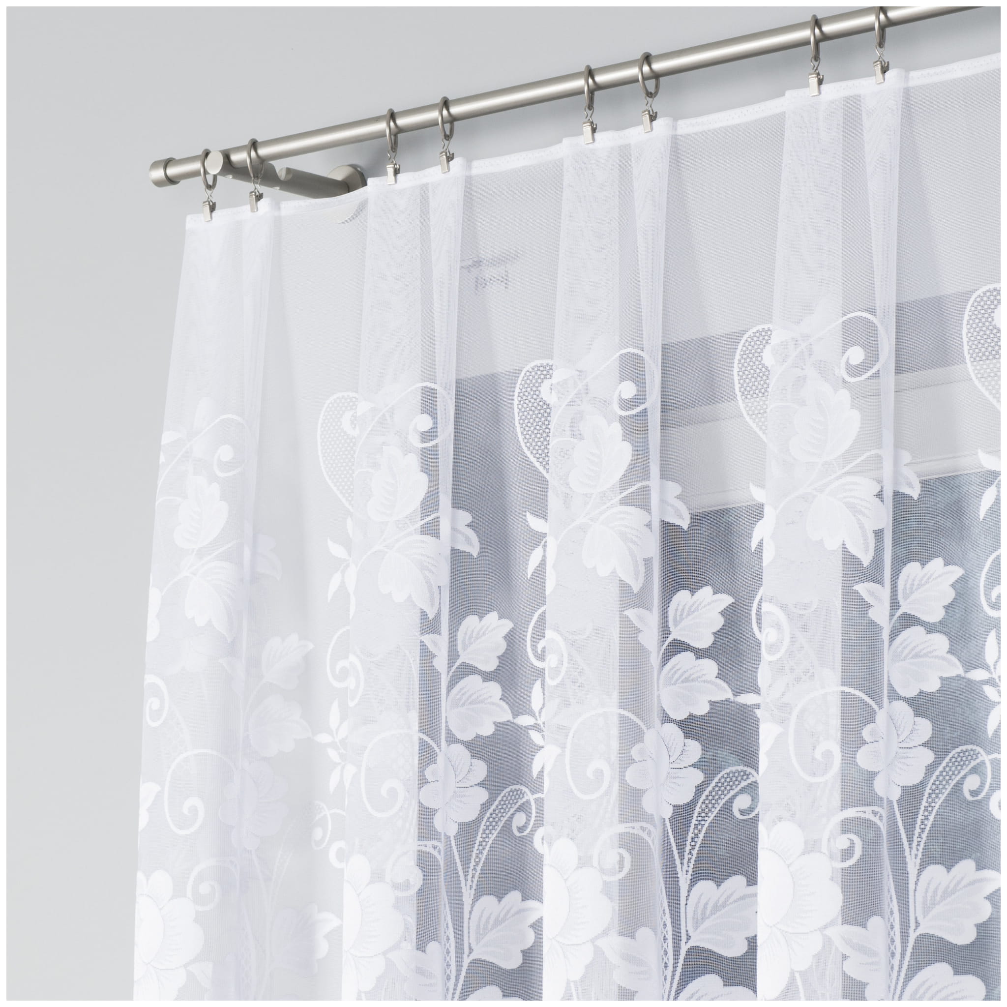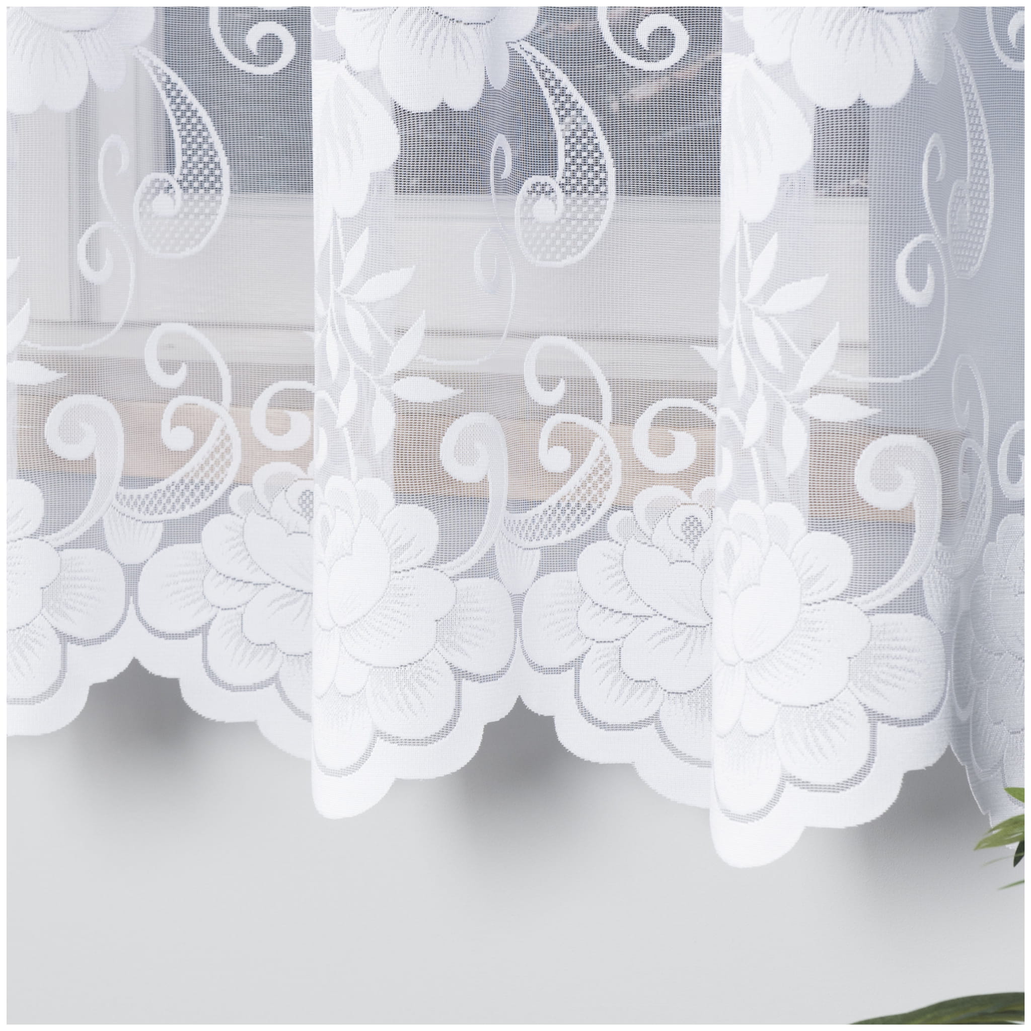 Gotowa firana żakardowa z kwiatowym wzorem. Firana jest lekka i podatna na układanie. Bardzo dobrze przepuszcza światło. Boki zostały starannie obszyte w naszej pracowni. Krótka firanka będzie idealna jako firana do kuchni lub pokoju. Gotowa do zawieszenia za pomocą żabek.