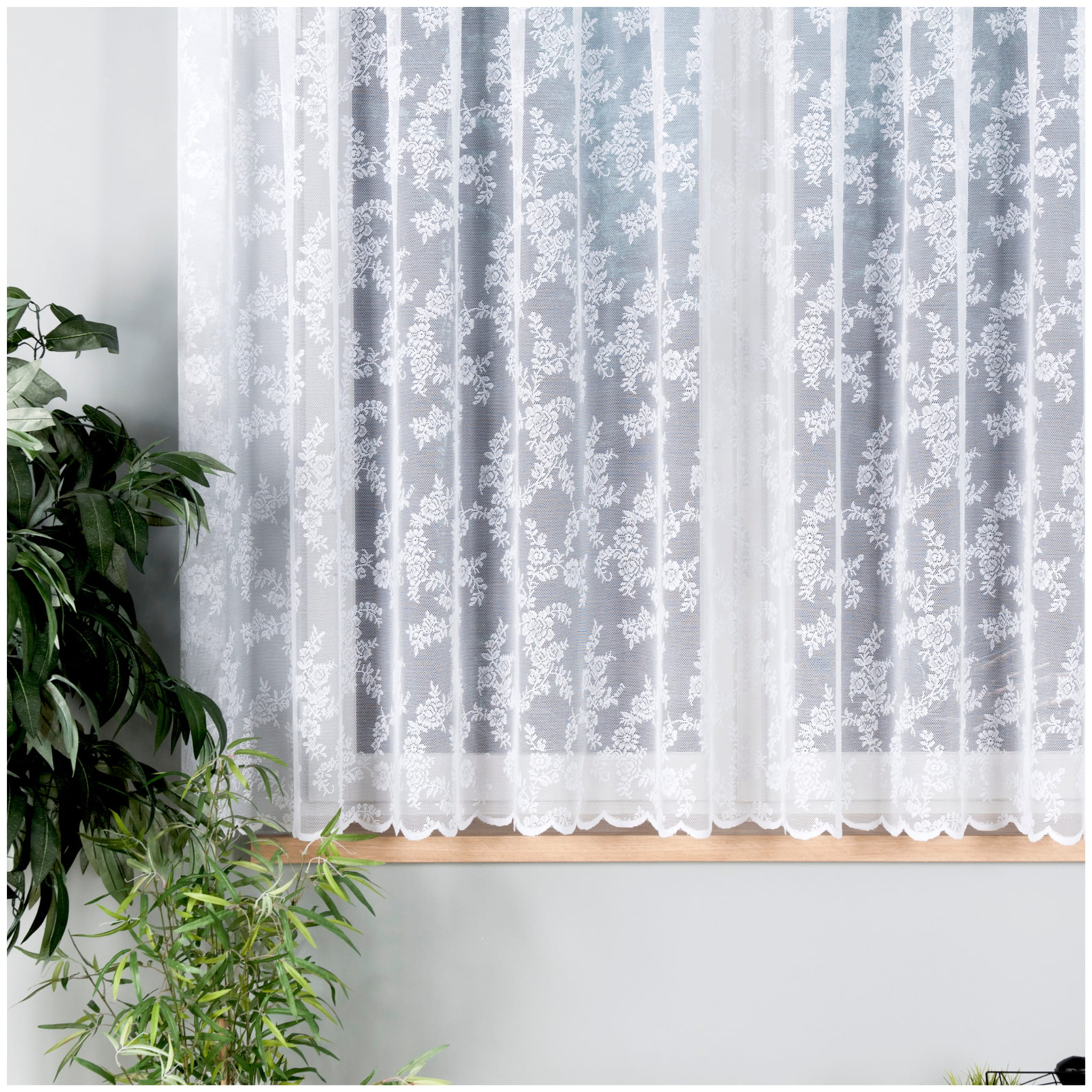 Gotowa firana żakardowa z kwiatowym wzorem. Firana jest lekka i podatna na układanie. Bardzo dobrze przepuszcza światło. Boki zostały starannie obszyte w naszej pracowni. Krótka firanka będzie idealna jako firana do kuchni lub pokoju. Gotowa do zawieszenia za pomocą żabek.