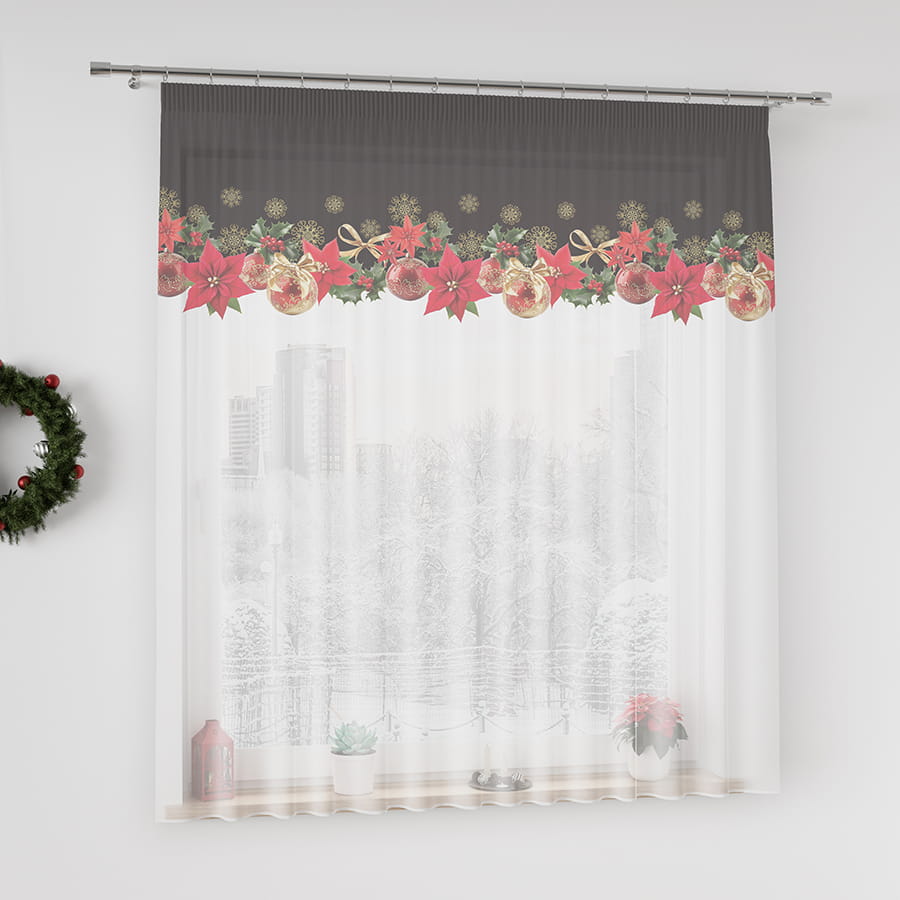 Firana Gotowa z motywem świątecznym wykonana została z tkaniny woalowej.