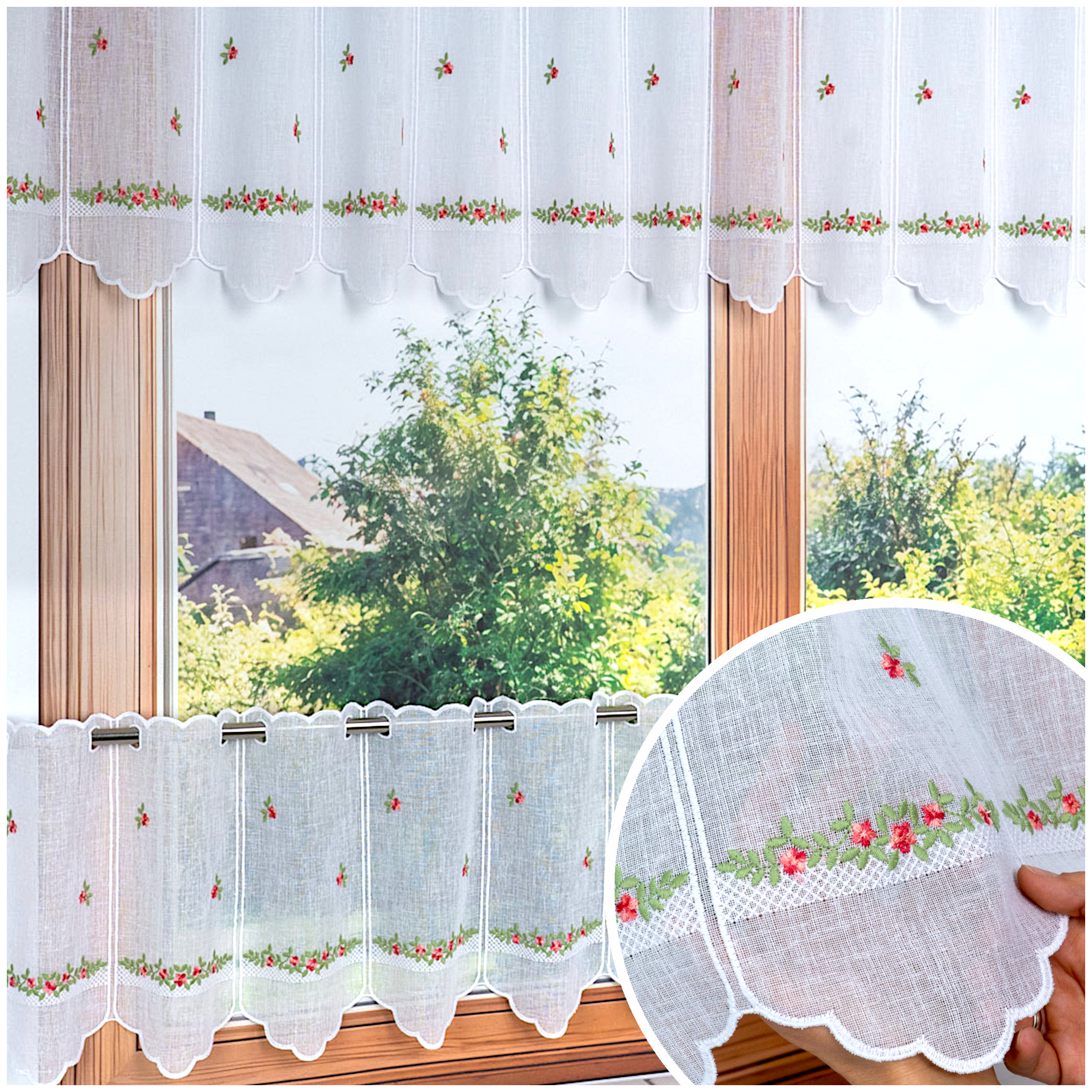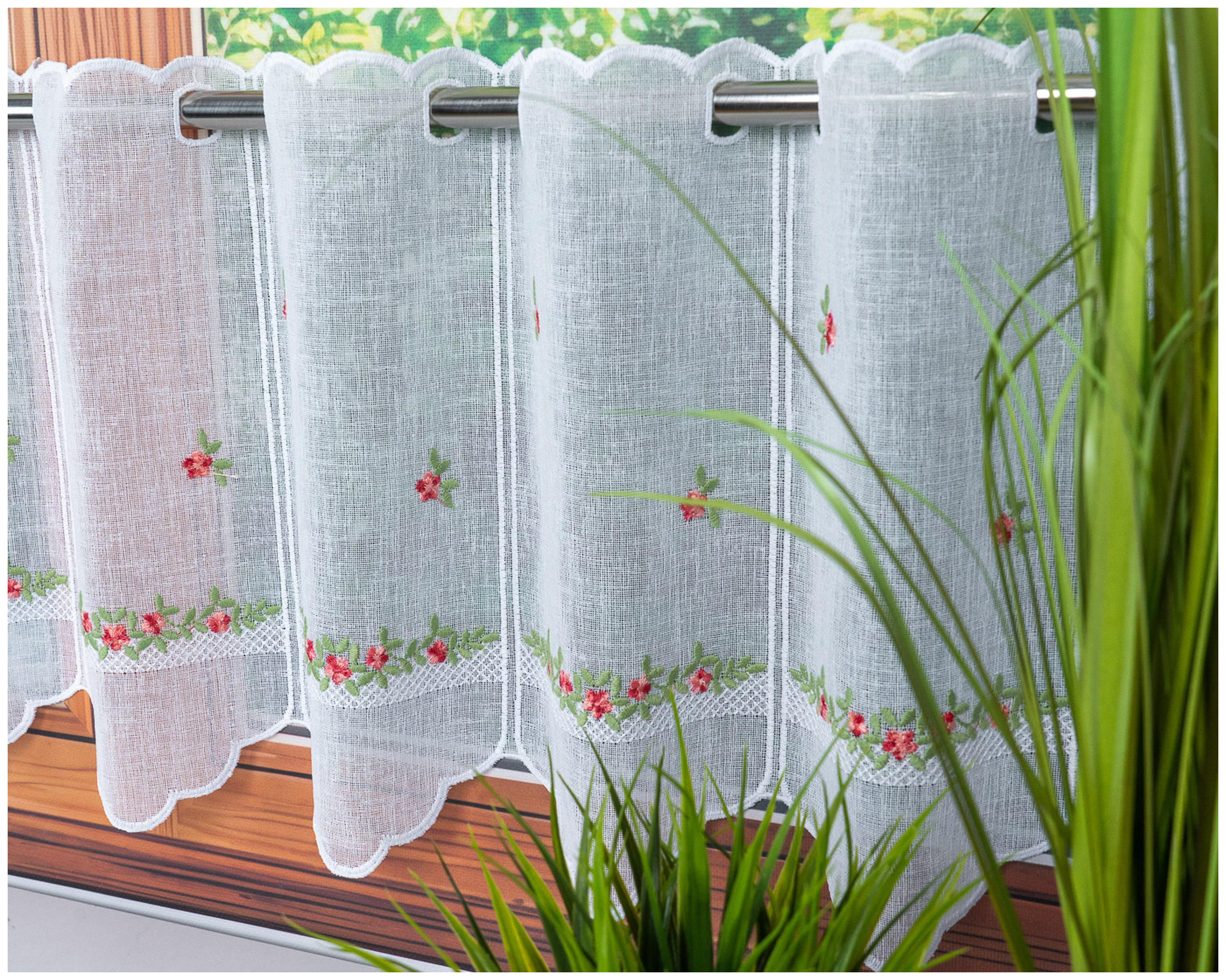 Haftowana firanka zazdrostka z subtelnym wzorem róż to doskonała propozycja do kuchni, jadalni lub salonu.
