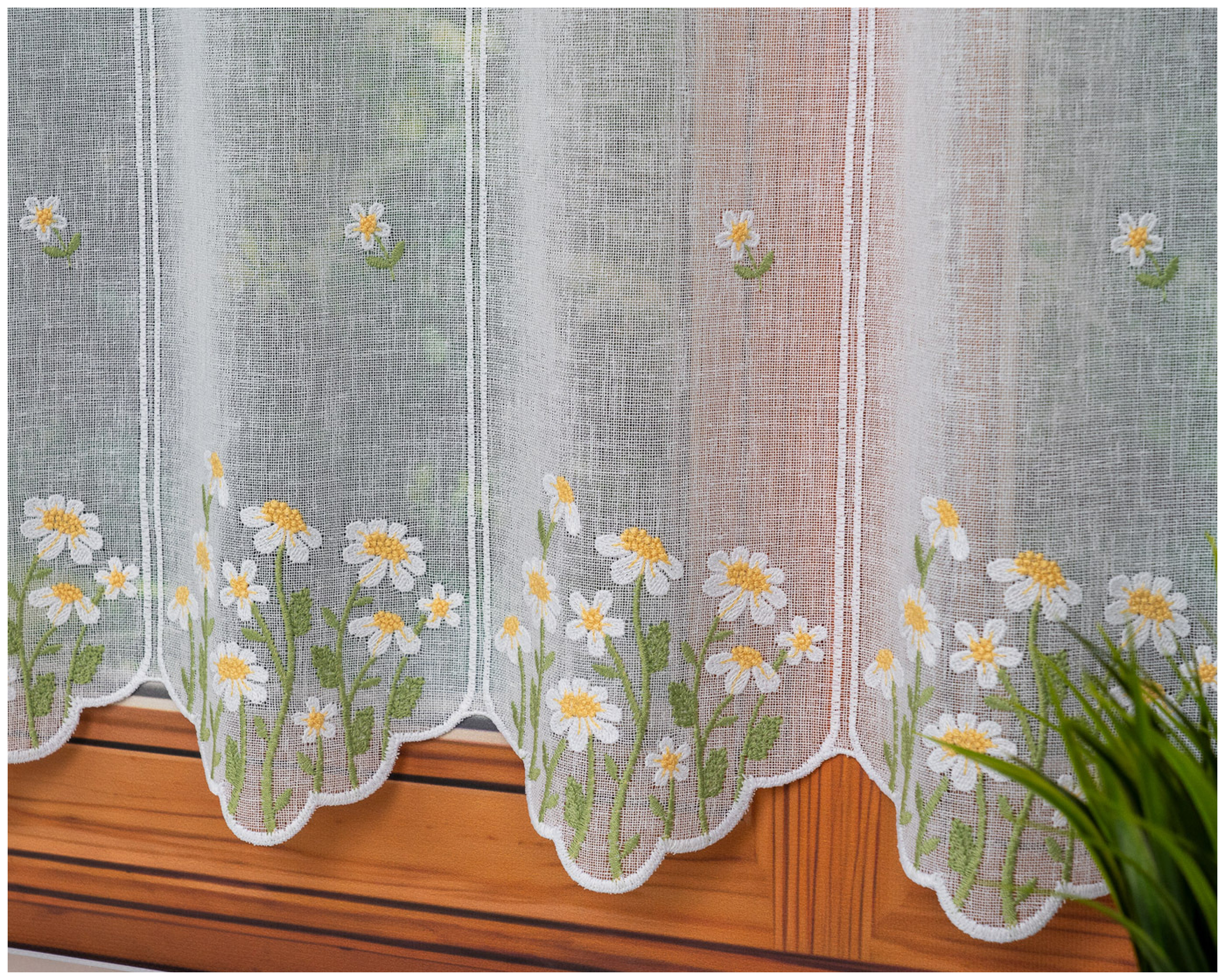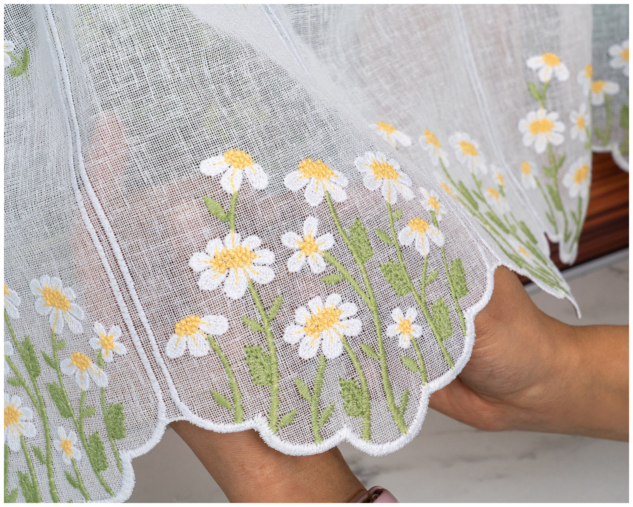 Największą ozdobą firanki jest starannie wykonany haft rumianków, który nadaje całości świeżego, wiosennego uroku. Dekoracyjny wzór kwiatowy pięknie komponuje się z jasnymi wnętrzami i drewnianymi dodatkami, tworząc ciepłą, domową atmosferę.