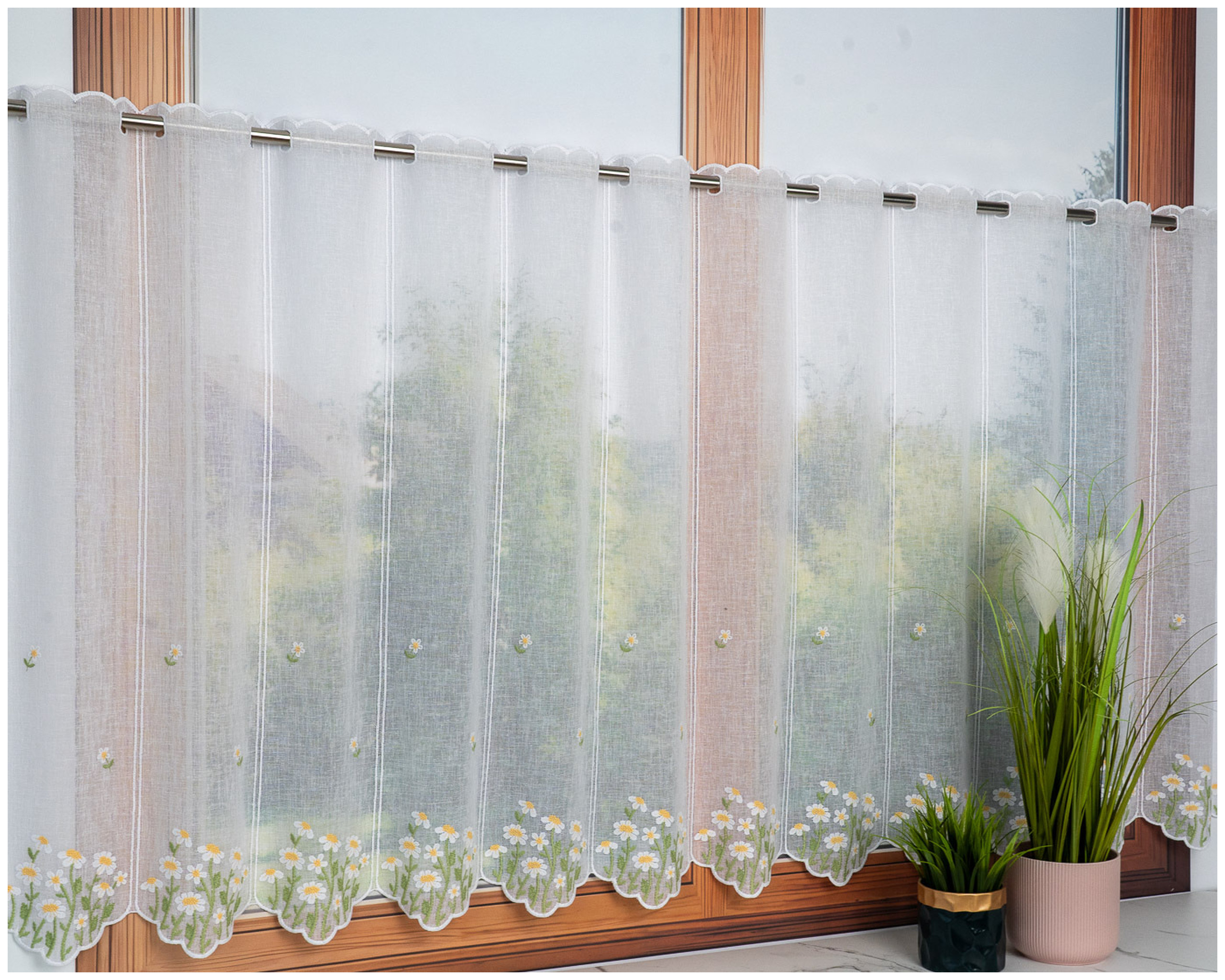 Największą ozdobą firanki jest starannie wykonany haft rumianków, który nadaje całości świeżego, wiosennego uroku. Dekoracyjny wzór kwiatowy pięknie komponuje się z jasnymi wnętrzami i drewnianymi dodatkami, tworząc ciepłą, domową atmosferę.