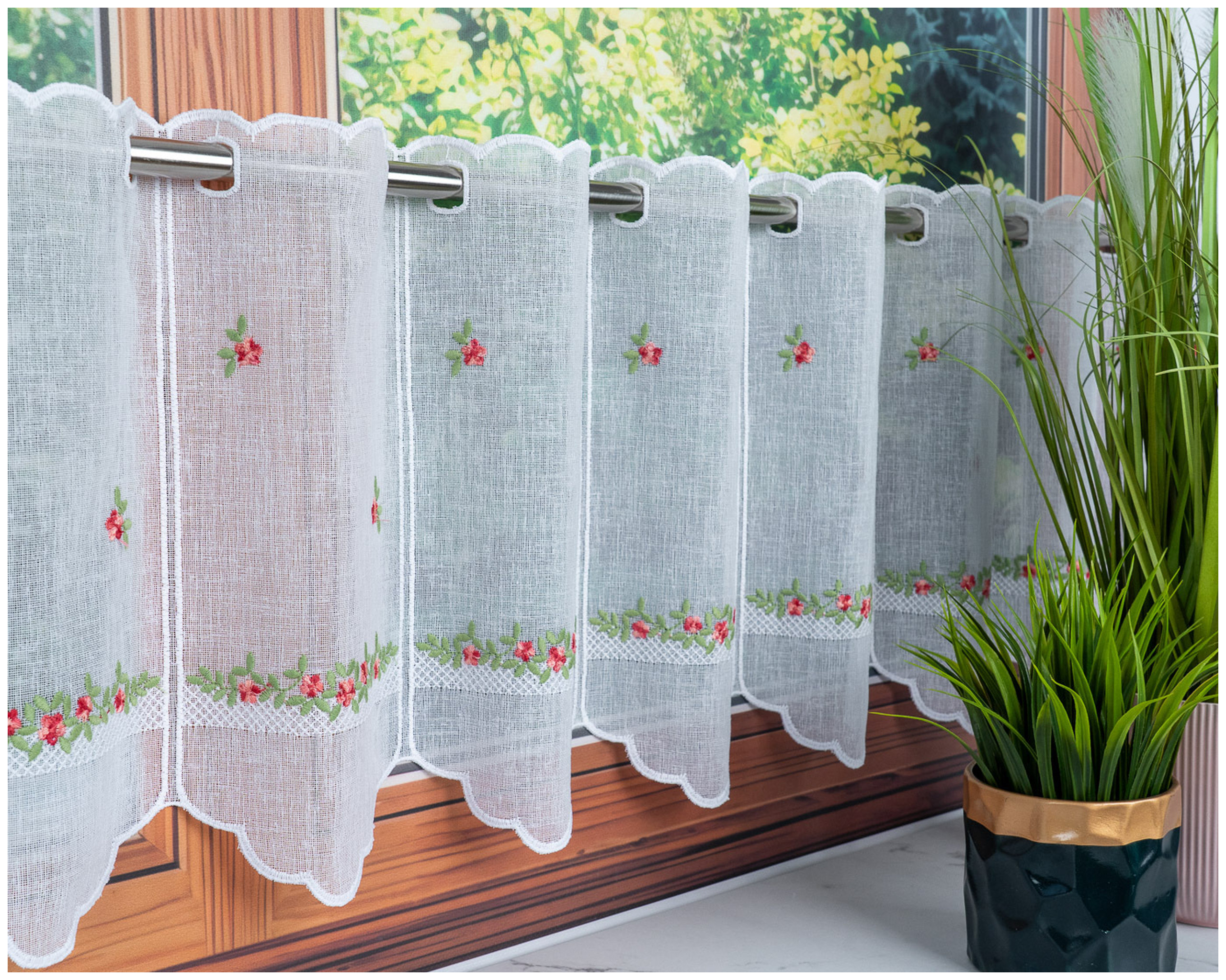 Największą ozdobą firanki jest starannie wykonany haft w różyczki, który nadaje całości świeżego, wiosennego uroku. Dekoracyjny wzór kwiatowy pięknie komponuje się z jasnymi wnętrzami i drewnianymi dodatkami, tworząc ciepłą, domową atmosferę.