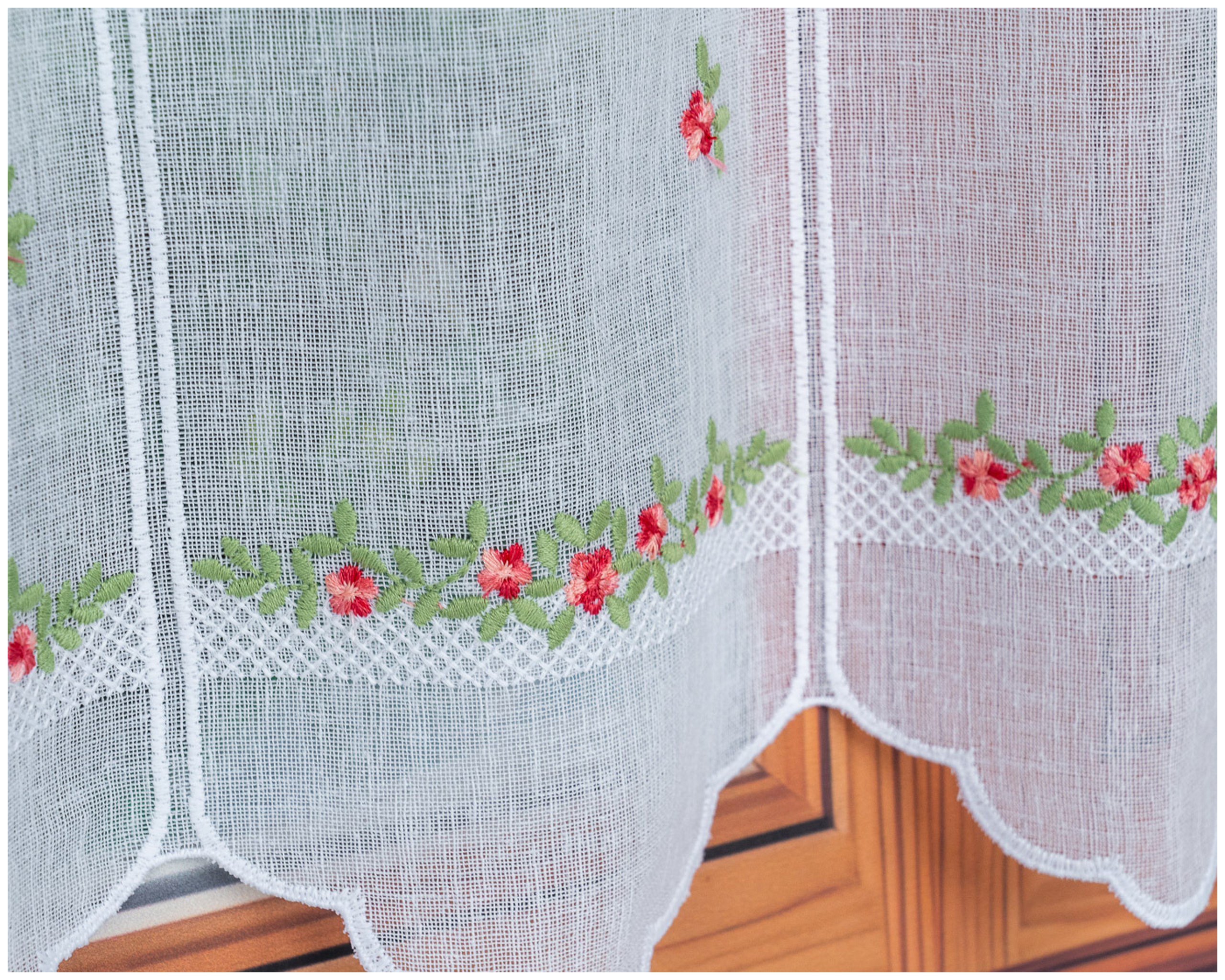 Haftowana firanka zazdrostka z subtelnym wzorem róż to doskonała propozycja do kuchni, jadalni lub salonu.