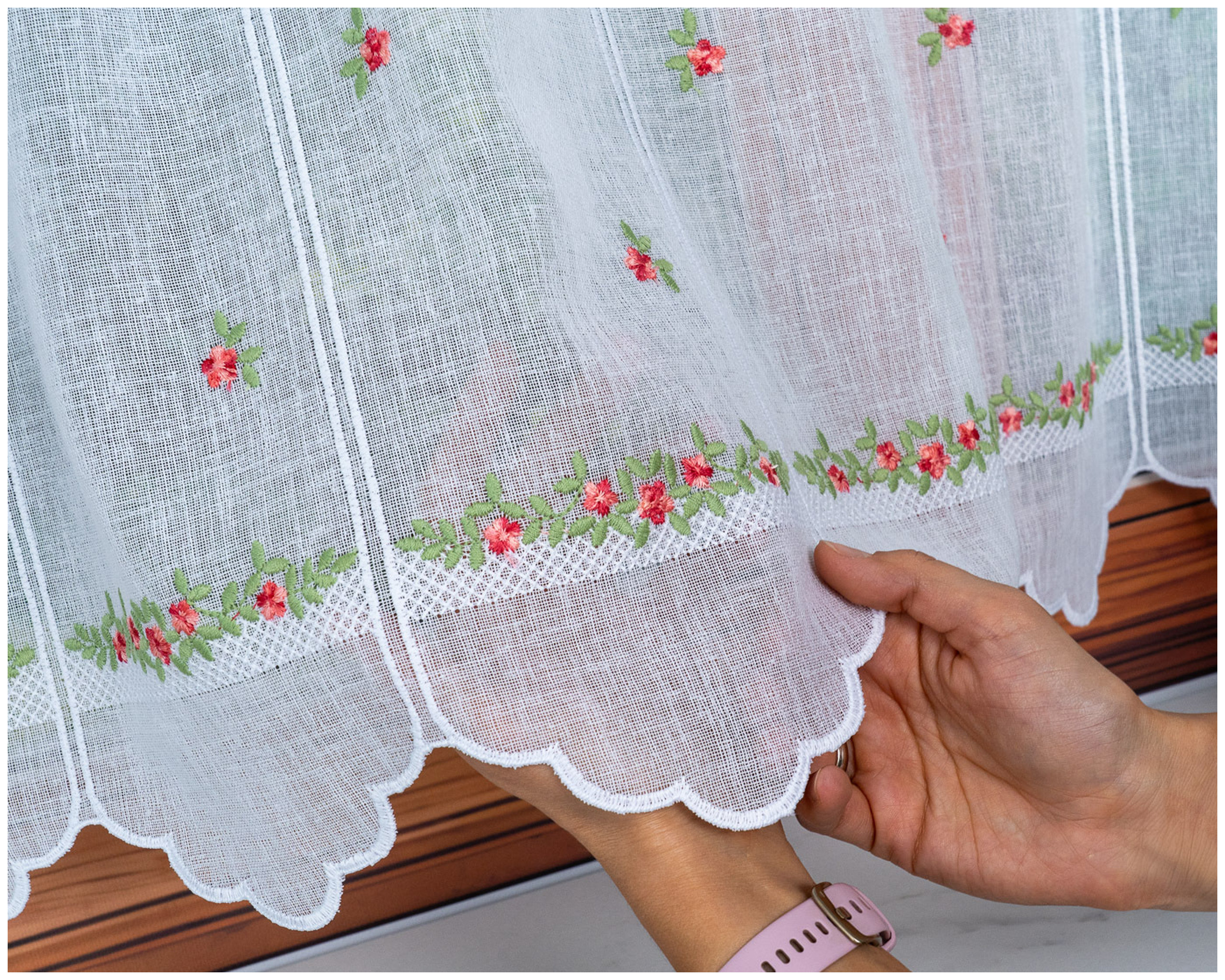 Największą ozdobą firanki jest starannie wykonany haft w różyczki, który nadaje całości świeżego, wiosennego uroku. Dekoracyjny wzór kwiatowy pięknie komponuje się z jasnymi wnętrzami i drewnianymi dodatkami, tworząc ciepłą, domową atmosferę.