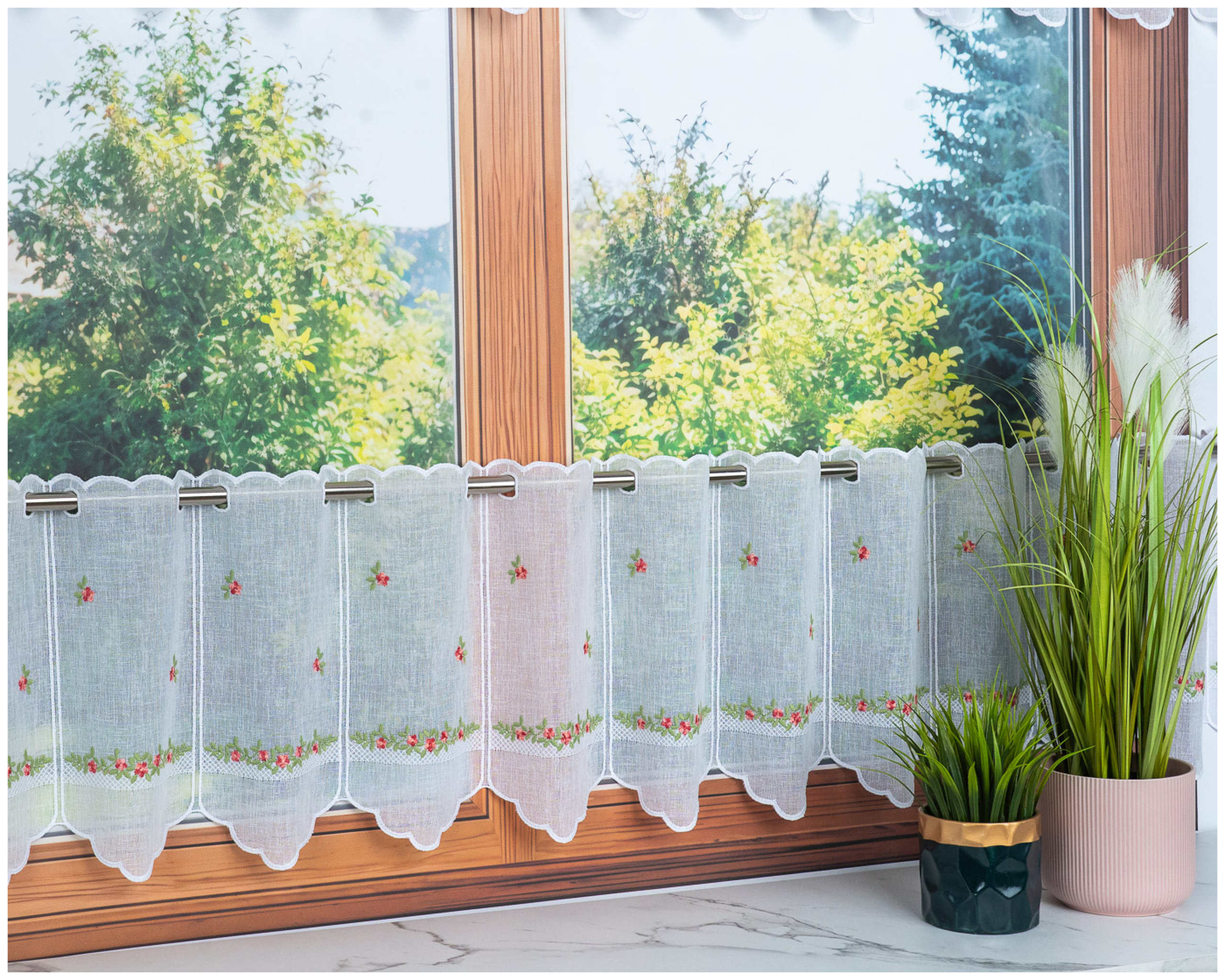 Haftowana firanka zazdrostka z subtelnym wzorem róż to doskonała propozycja do kuchni, jadalni lub salonu.