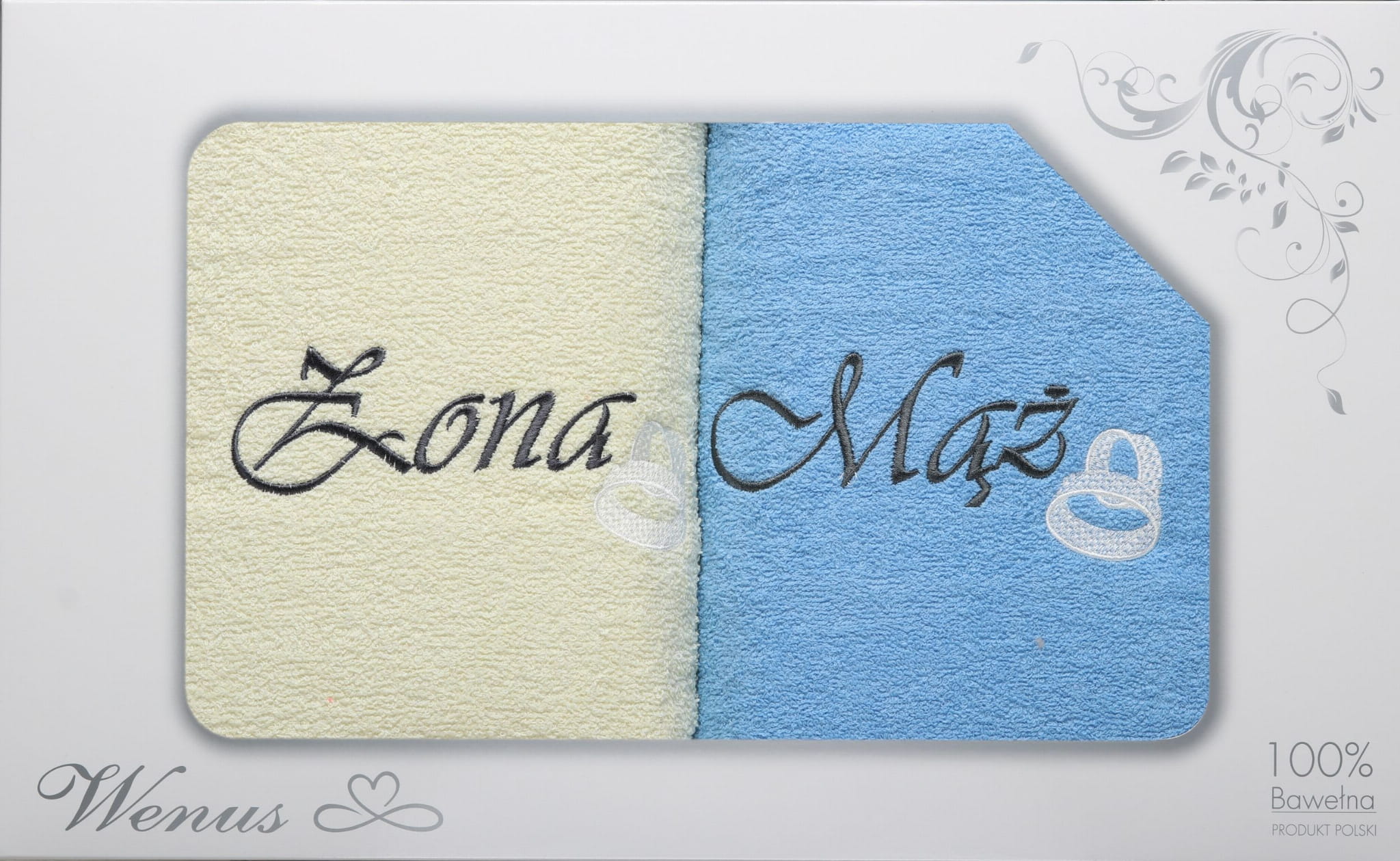 Komplet Ręczników 2szt. 70x140 Żona Mąż Ślub Rocznica Krem+Niebieski 9424