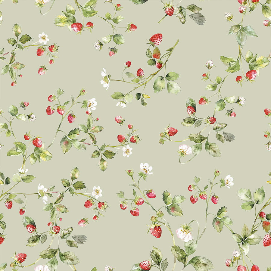 Materiał na Metry Poziomki na Szałwiowym tle. Materiał jest miękki, matowy i charakteryzuje się trwałym, jednostronnym wzorem poziomek.