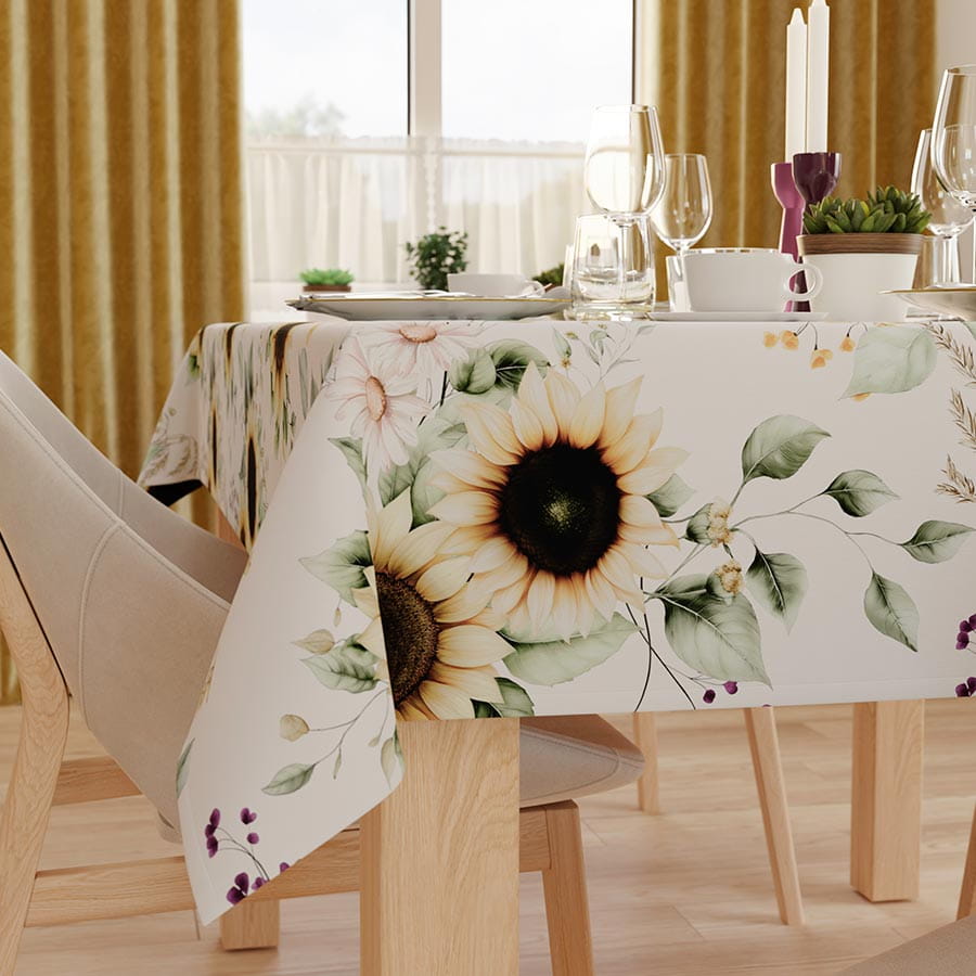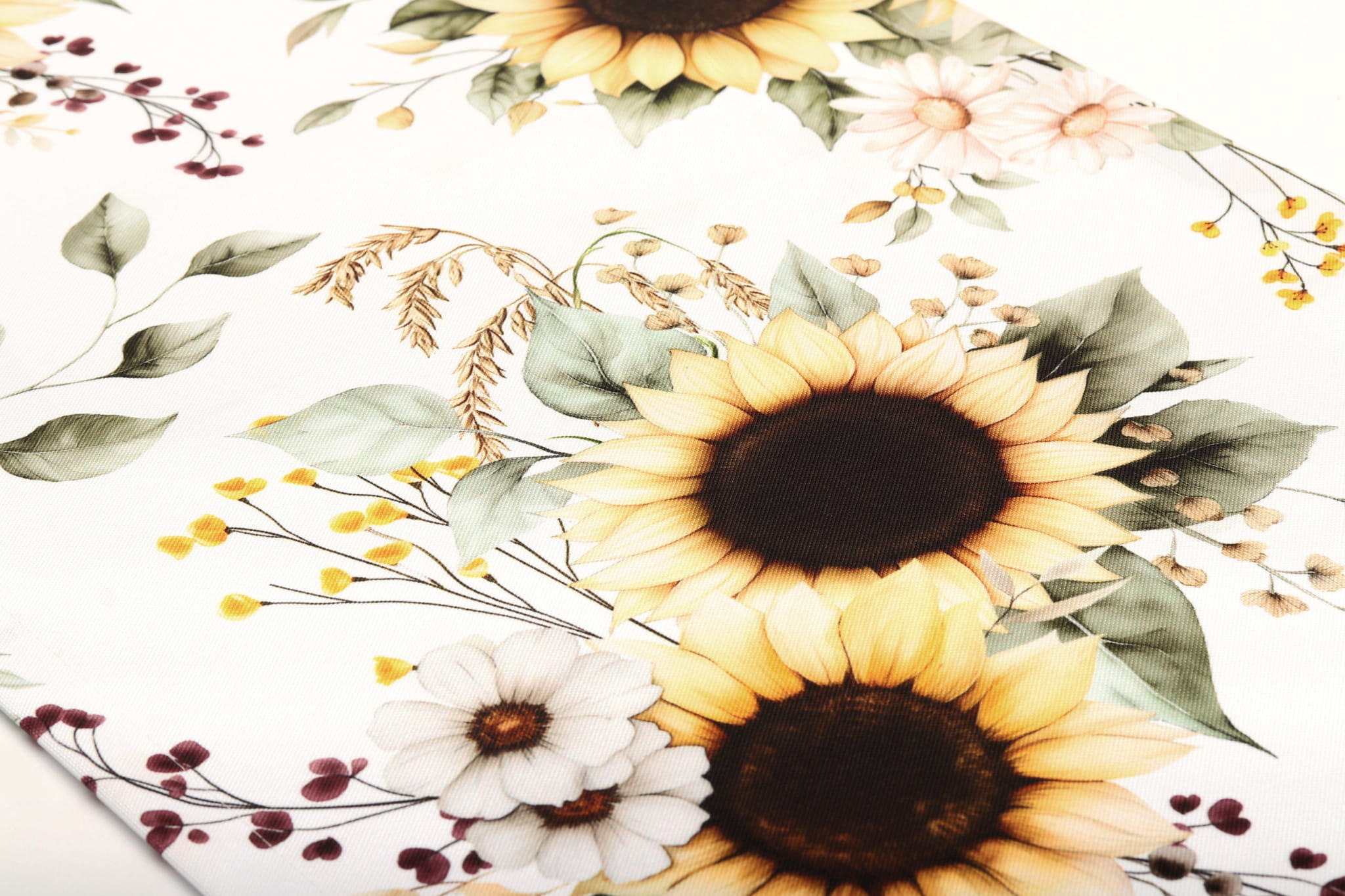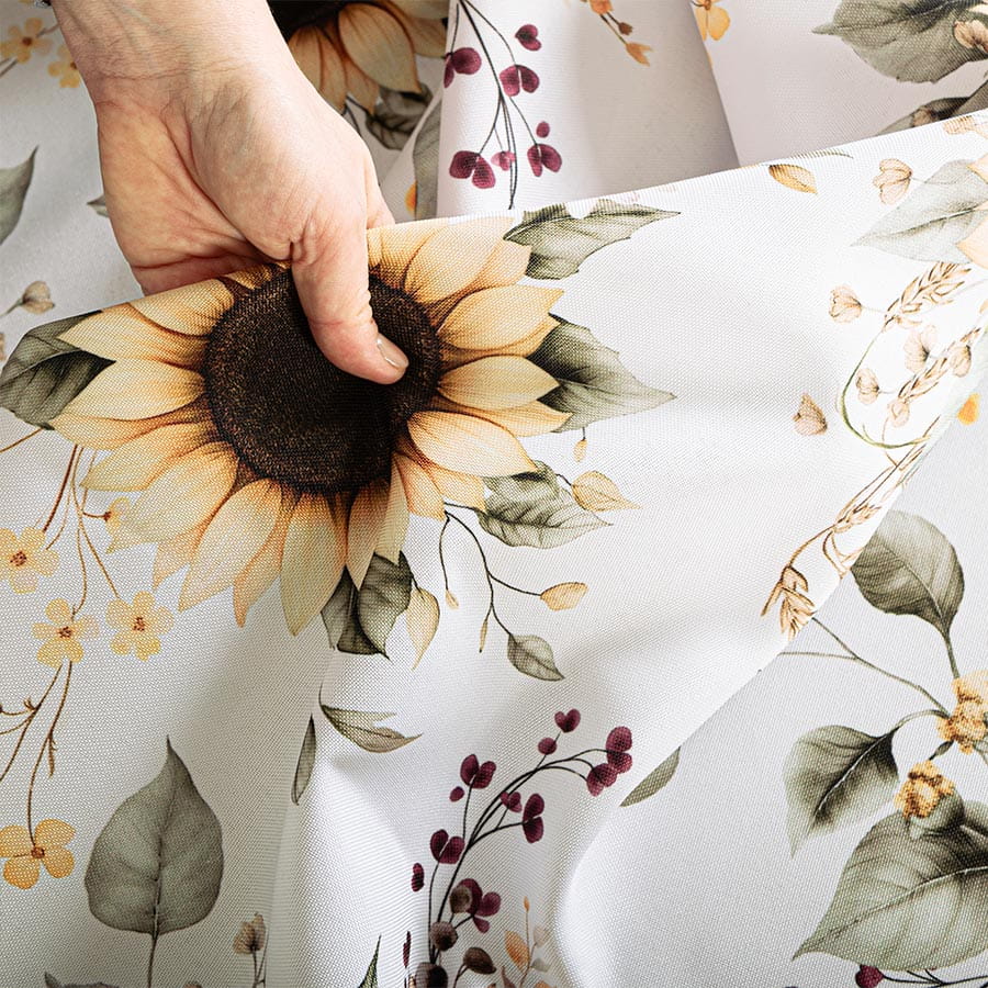 Materiał na Metry Słoneczniki. Materiał jest miękki, matowy i charakteryzuje się trwałym, jednostronnym nadrukiem w piękne słoneczniki.