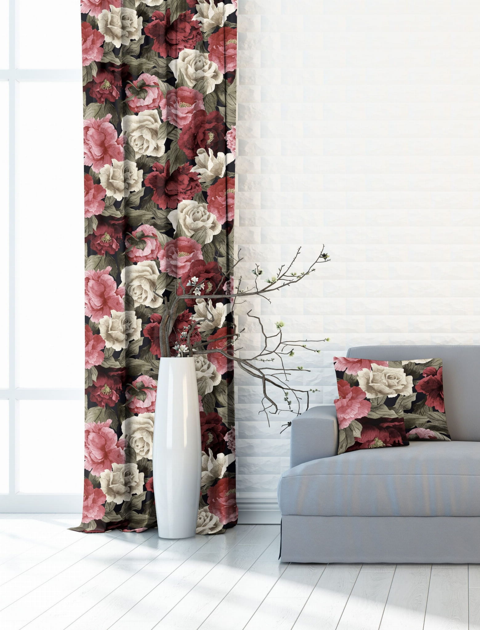 Piękna tkanina na zasłony w kwiaty w odcieniach różu i bordo. Materiał jest średniej grubości z jednostronnym nadrukiem. Bardzo dobrze się układa, idealnie sprawdzi się nie tylko na zasłony, ale również na poszewki, bieżniki, podpięcia i obrusy. Cena dotyczy 1m wysokości tkaniny o szerokości 150 cm.