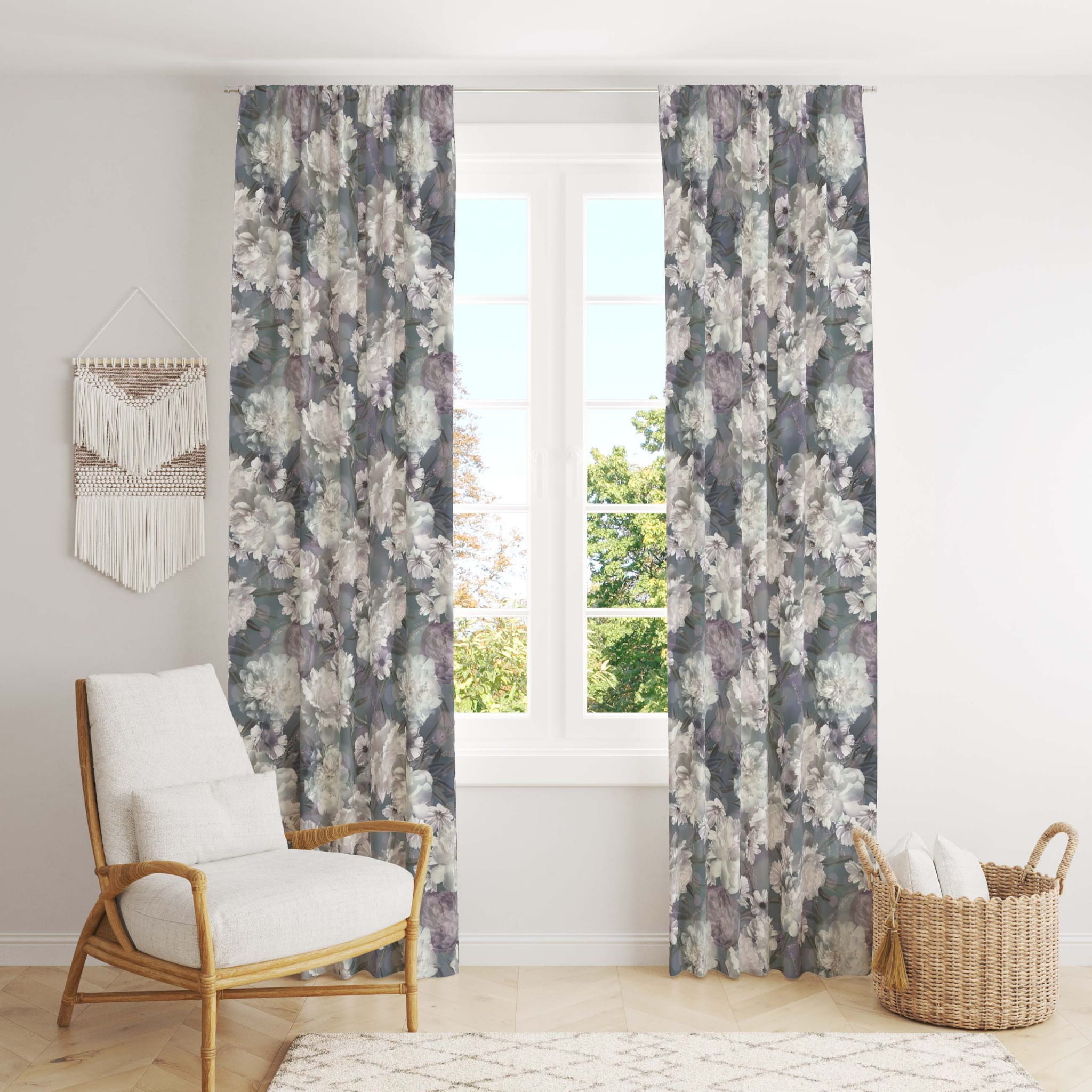 Materiał zasłonowy w kwiaty. Tkanina jest średniej grubości z jednostronnym nadrukiem i delikatnym meszkiem.