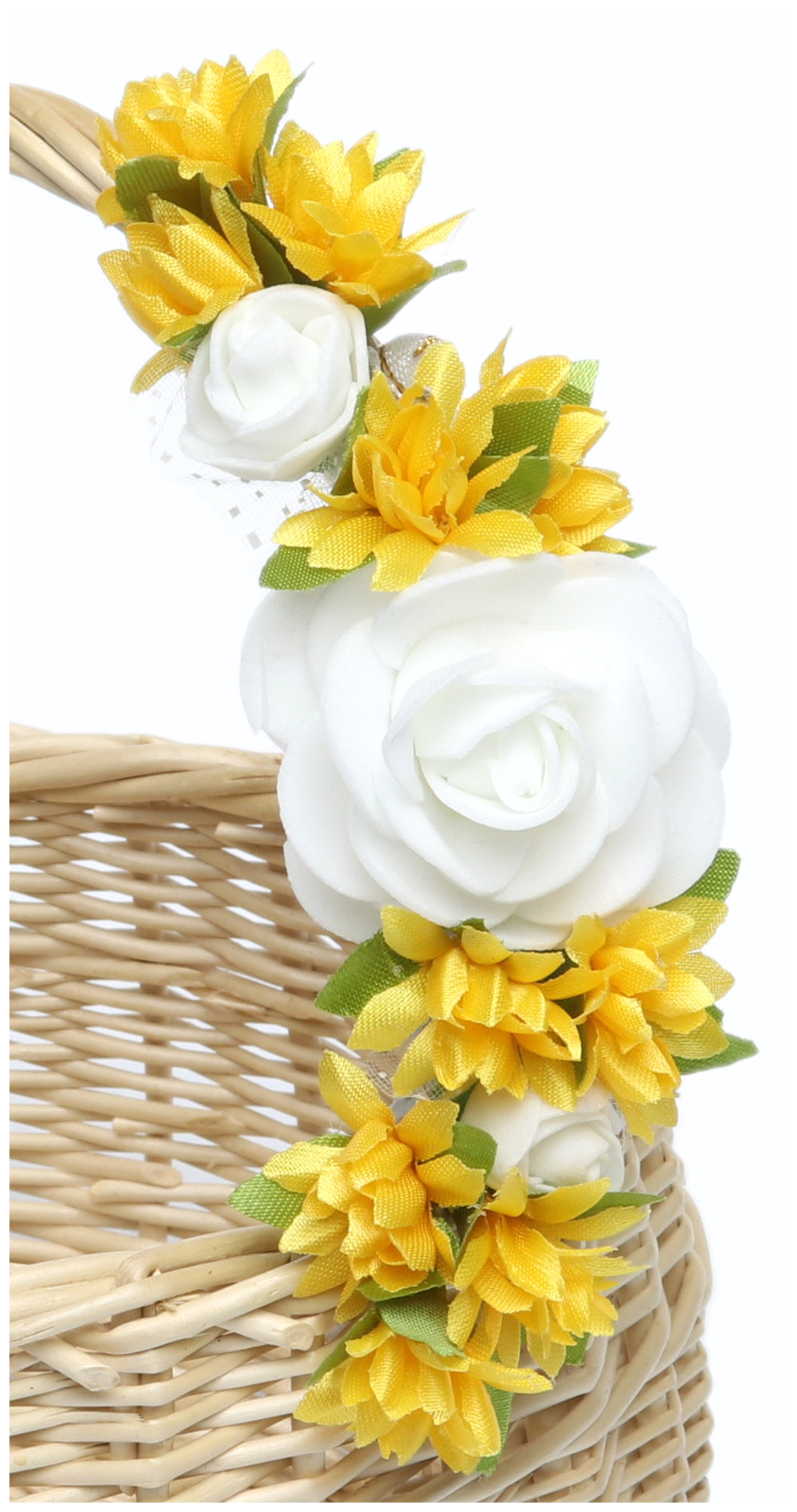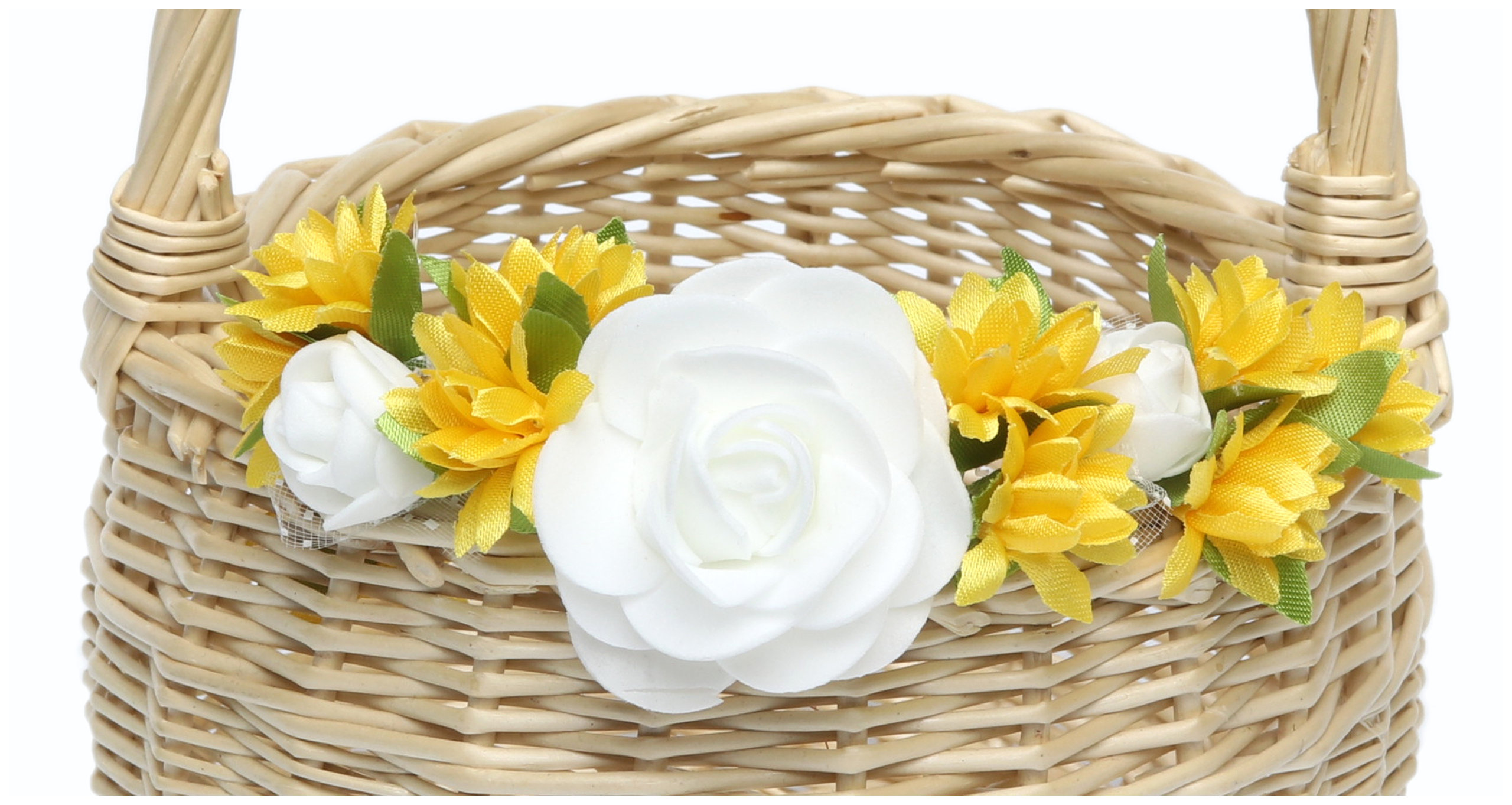 Piękna, subtelna ozdoba na koszyczek wykonana ze sztucznych kwiatów. Idealnie dopełni wygląd Twojego koszyczka Wielkanocnego.