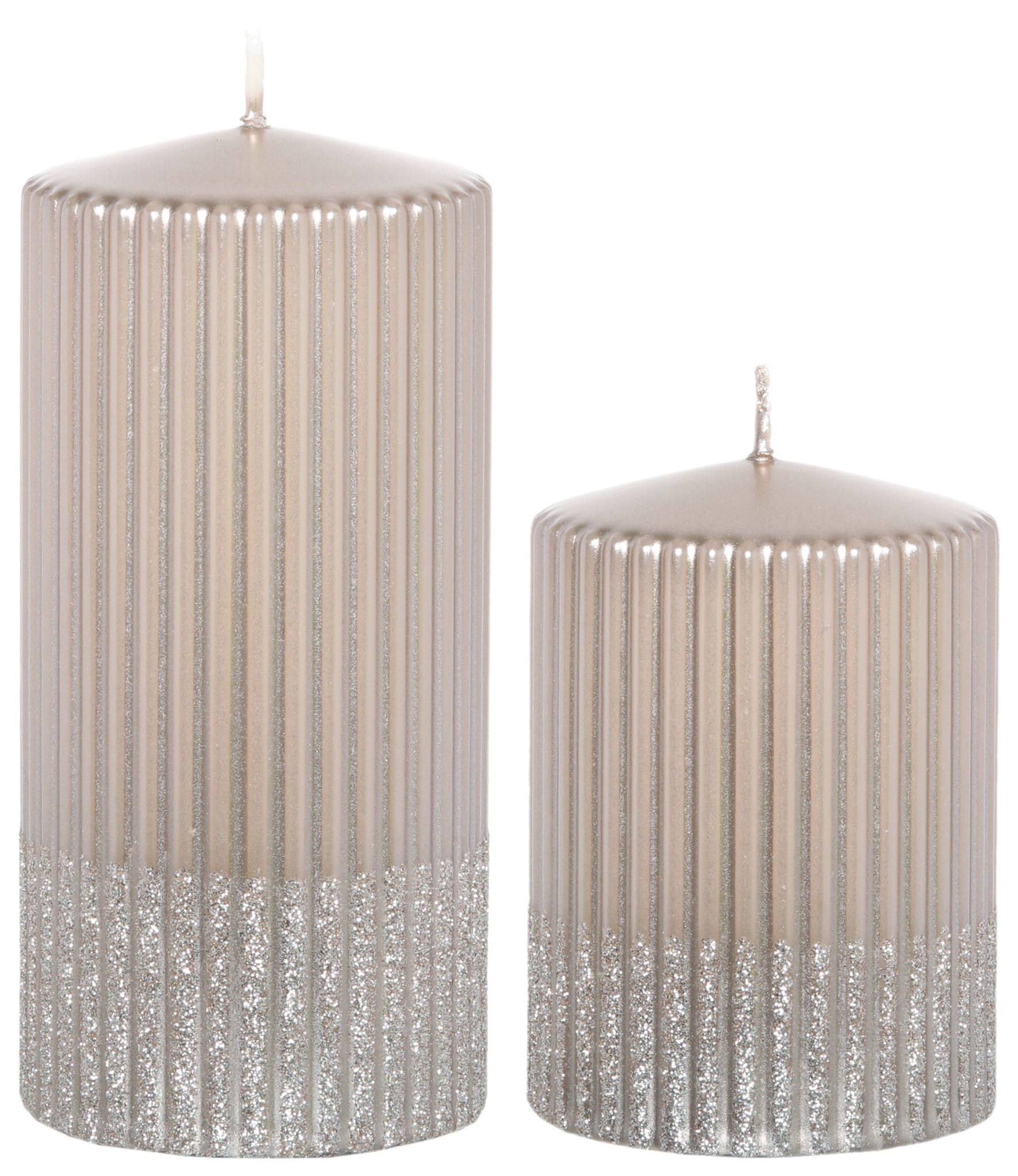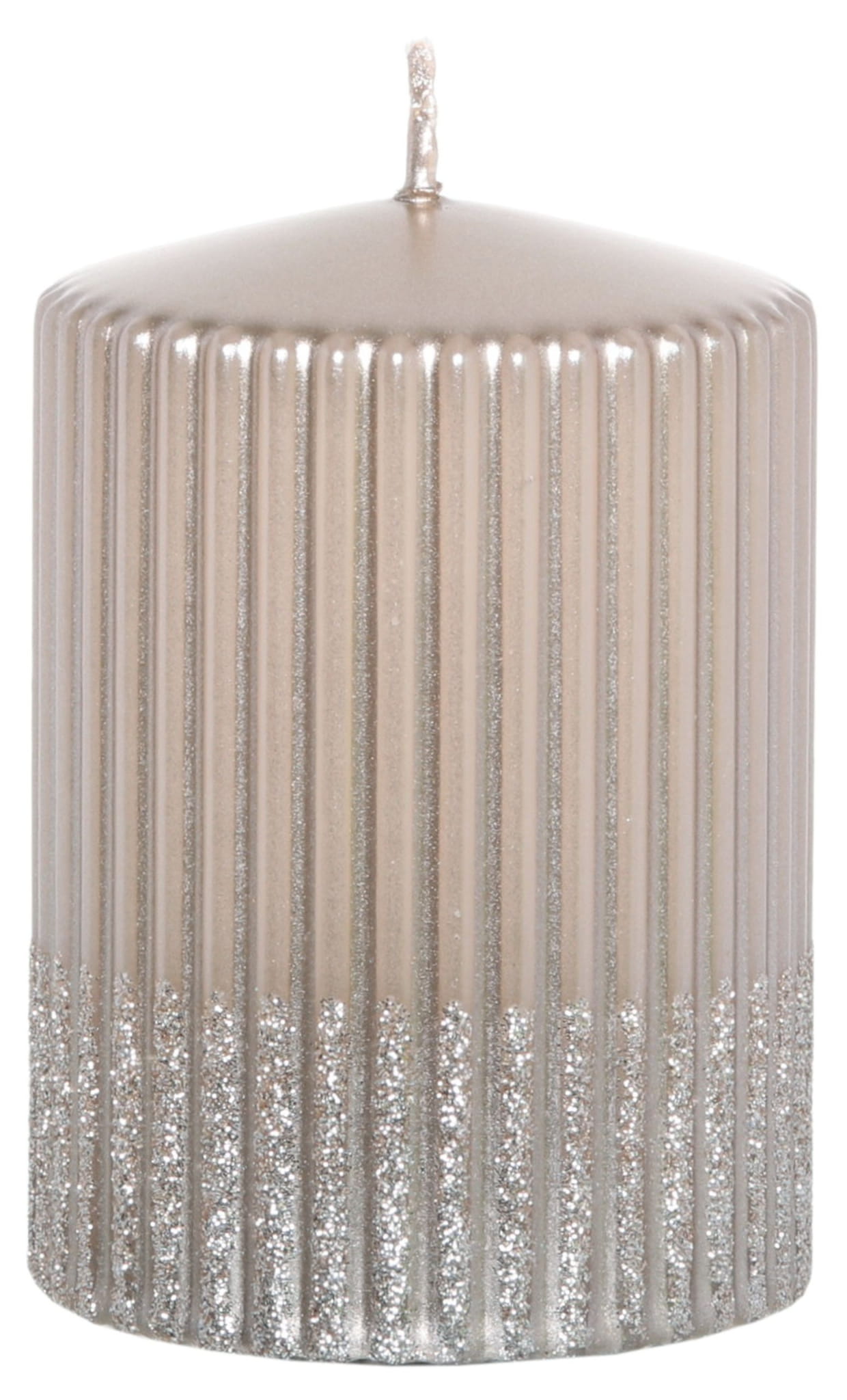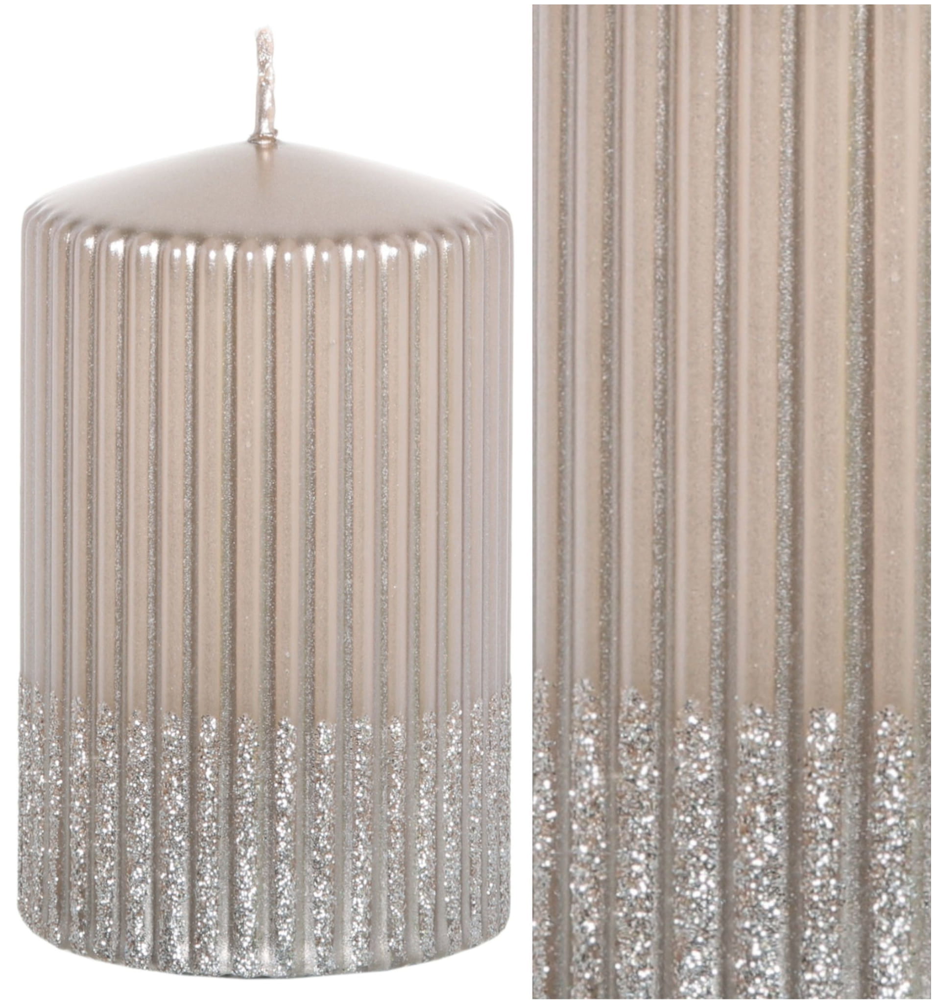 Świeca Świąteczna Dekoracyjna. Świeca w kolorze beżowym metalicznym, ozdobiona połyskującym brokatem.