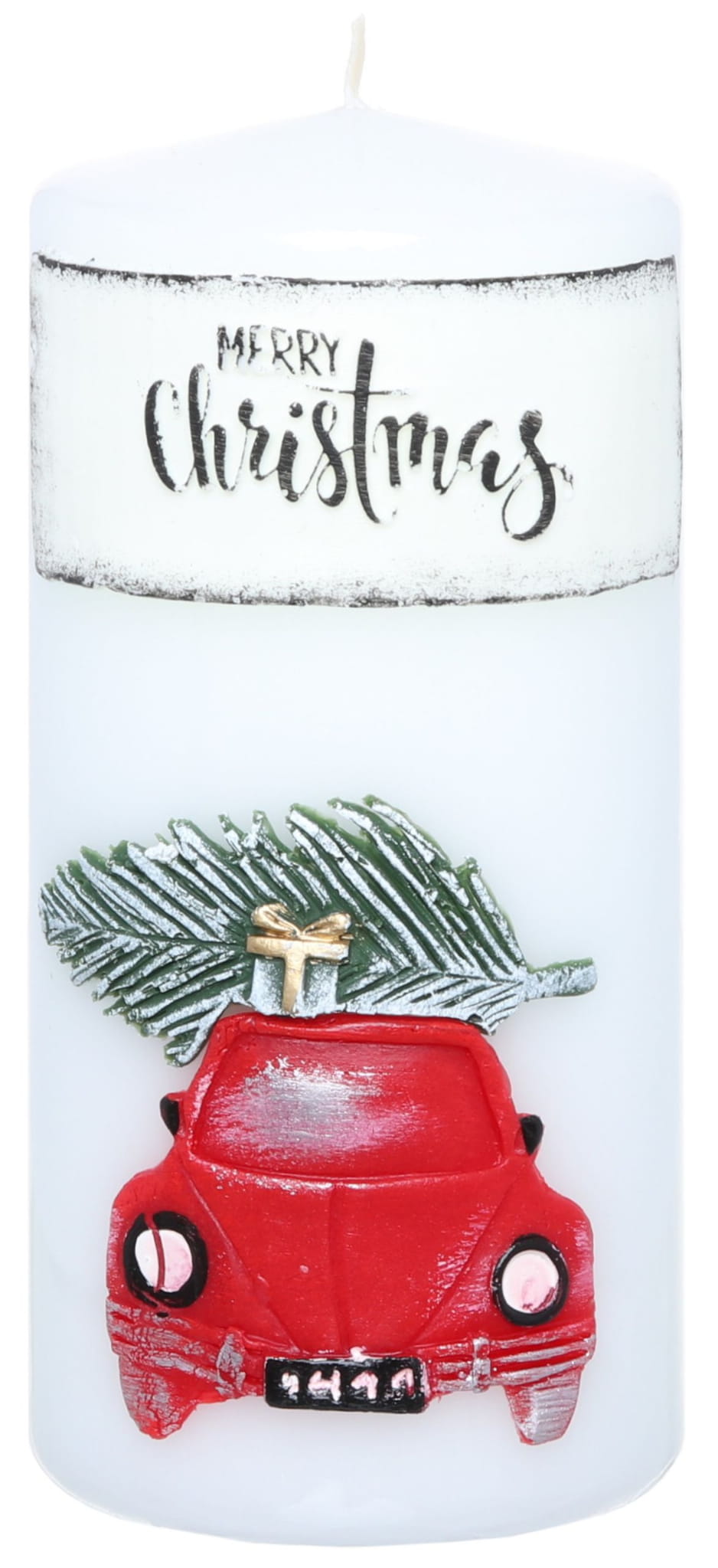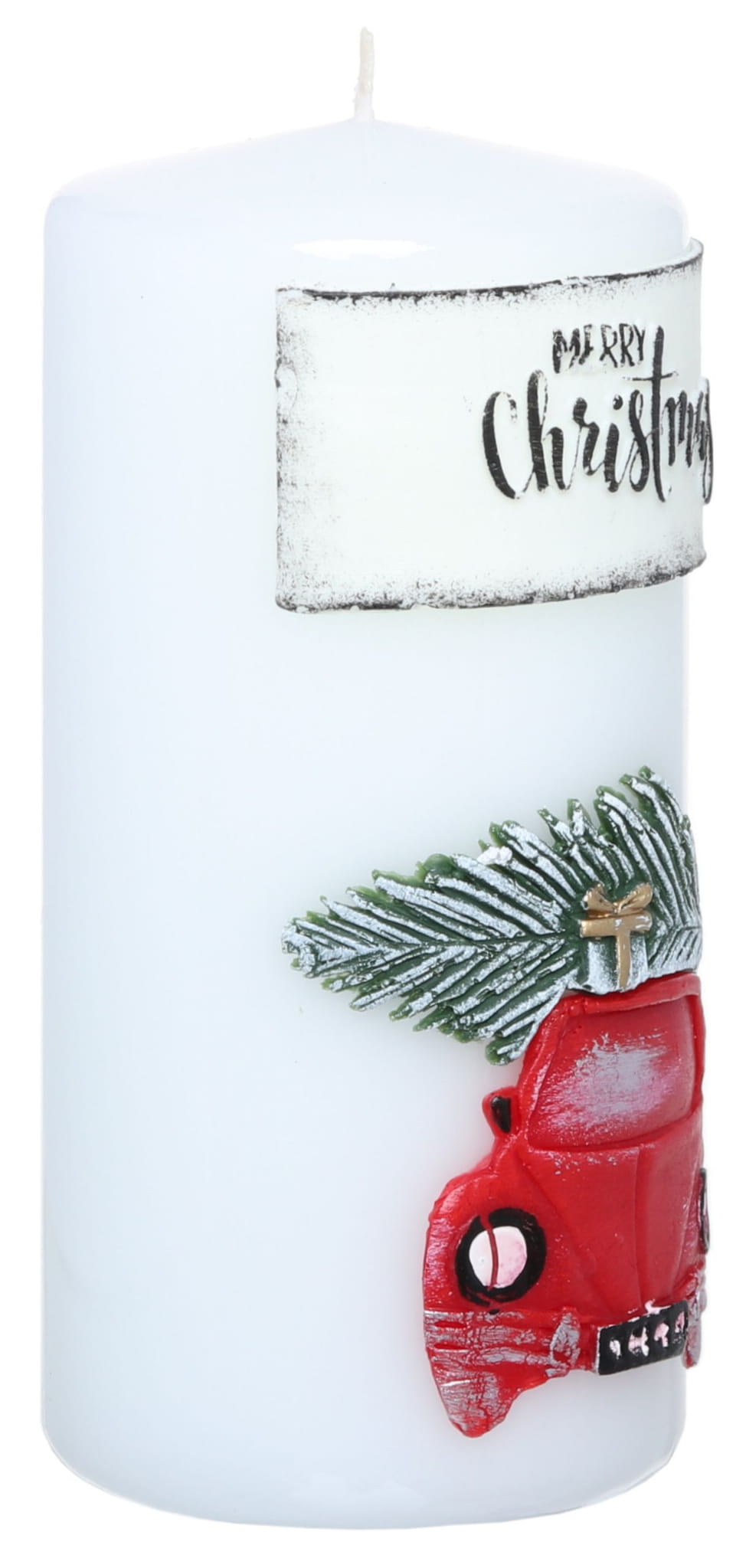 Świeca Świąteczna Dekoracyjna lakierowana w kolorze białym. Ozdobiona świątecznym, czerwonym samochodem.