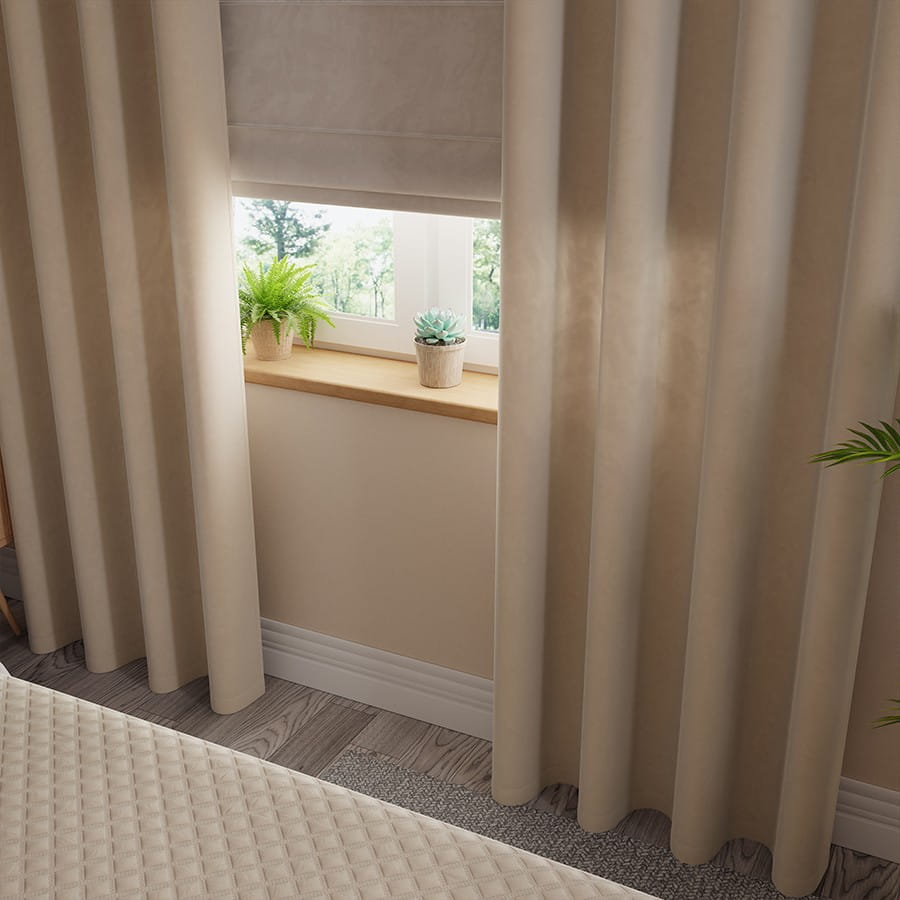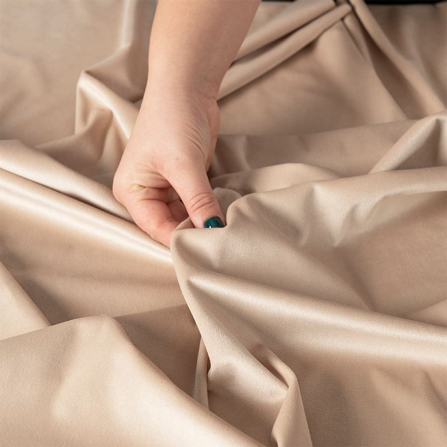 Zasłona wykonana z miękkiej, lejącej tkaniny welurowej z delikatnym meszkiem.