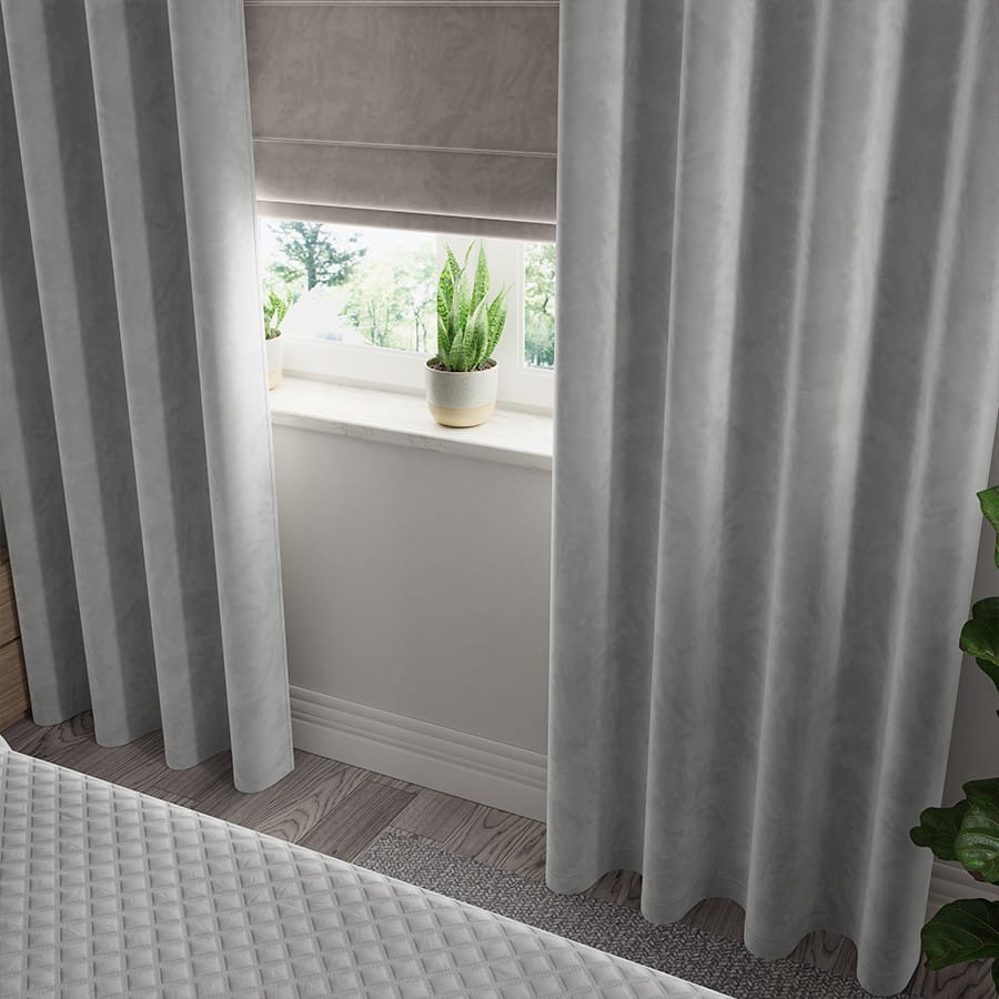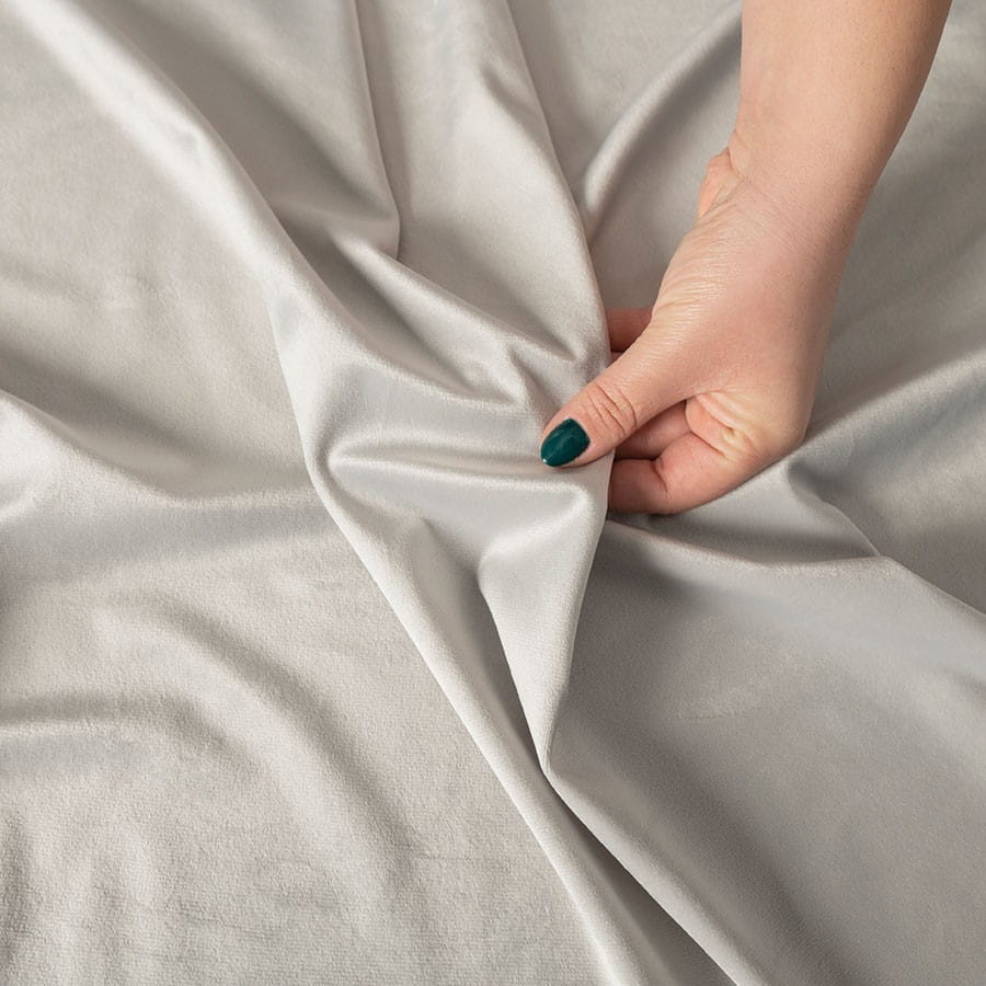 Zasłona wykonana z miękkiej, lejącej tkaniny welurowej z delikatnym meszkiem.