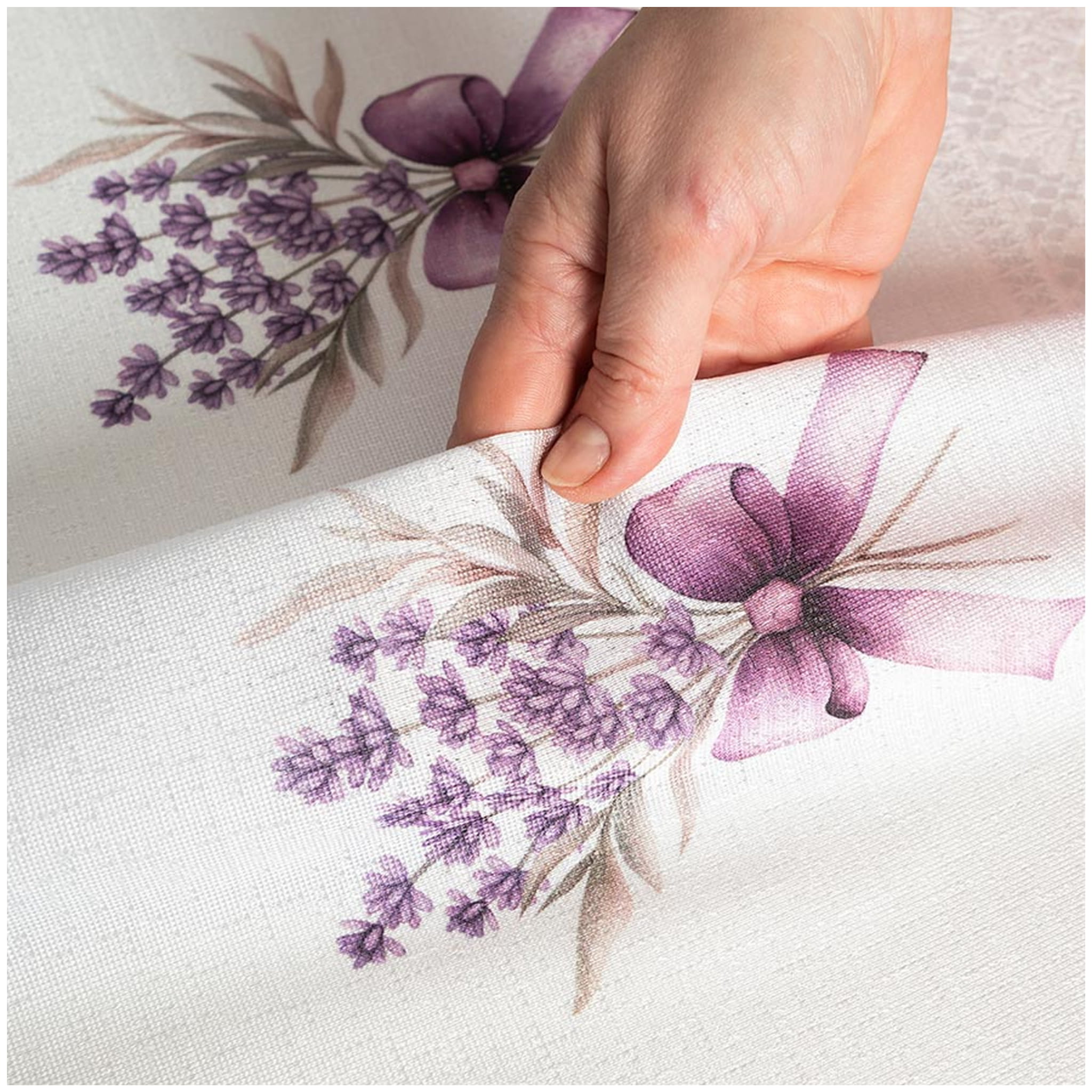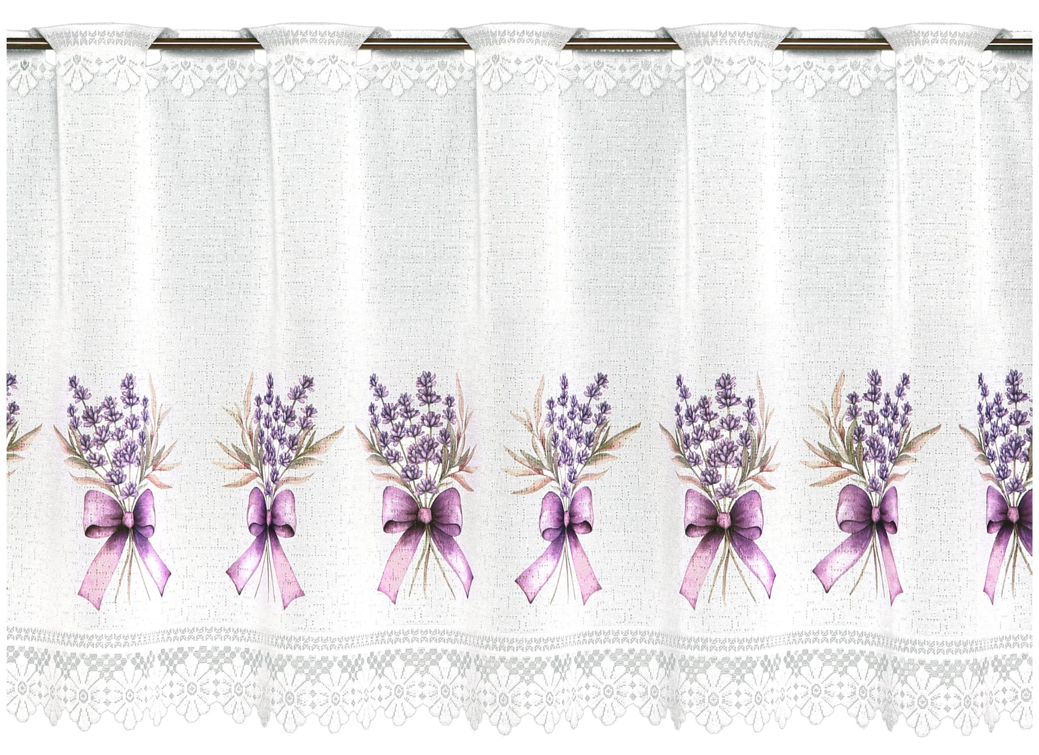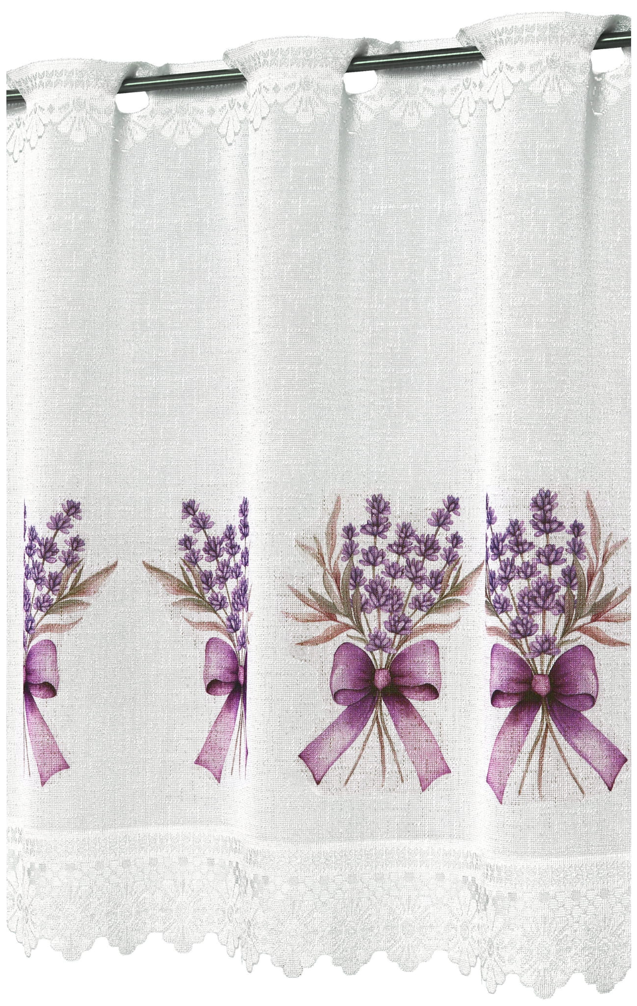 Zazdrostka wykonana z trwałej i wytrzymałej tkaniny żakardowej ozdobionej motywem lawendy. Zazdrostka jest lekka i podatna na układanie.