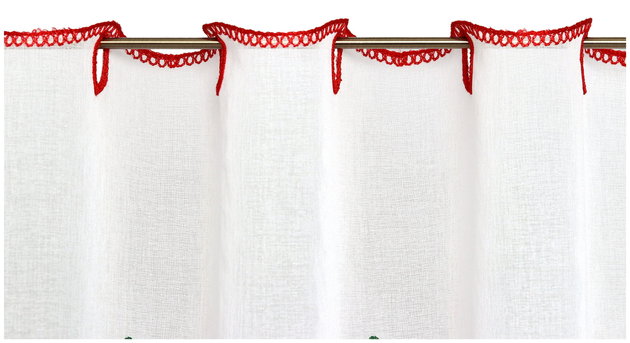 Wprowadź do swojego domu wyjątkowy, świąteczny nastrój dzięki uroczej zazdrostce ze świątecznym haftem. Ta delikatna firanka została wykonana z wysokiej jakości batystu, który subtelnie przepuszcza światło, tworząc przytulną atmosferę.