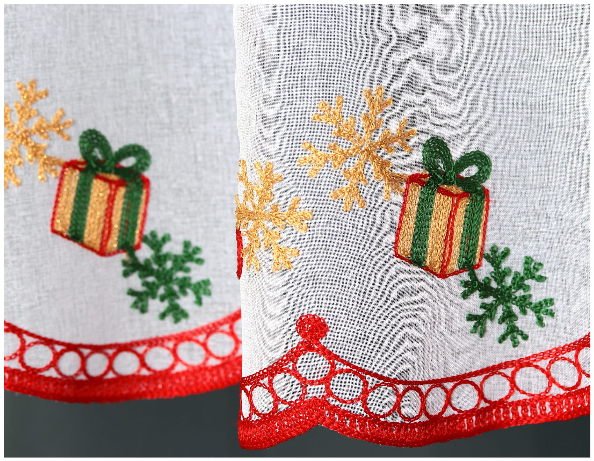 Wprowadź do swojego domu wyjątkowy, świąteczny nastrój dzięki uroczej zazdrostce ze świątecznym haftem. Ta delikatna firanka została wykonana z wysokiej jakości batystu, który subtelnie przepuszcza światło, tworząc przytulną atmosferę.